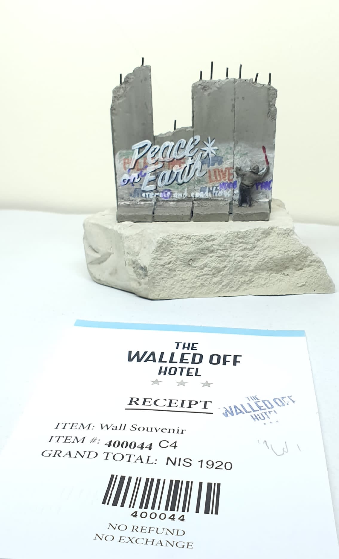 "Walled Off Hotel - Four-Part Souvenir Defeated Wall Section (Peace On Earth)". Hand-painted resin sculpture with West Bank Separation Wall base; 12cm high inc base.