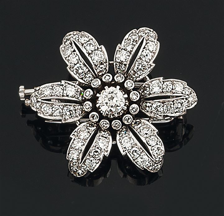 Spilla oro bianco a forma di fiore con diamanti taglio brillante e 8/8 per complessivi ct 3,70 ca
