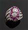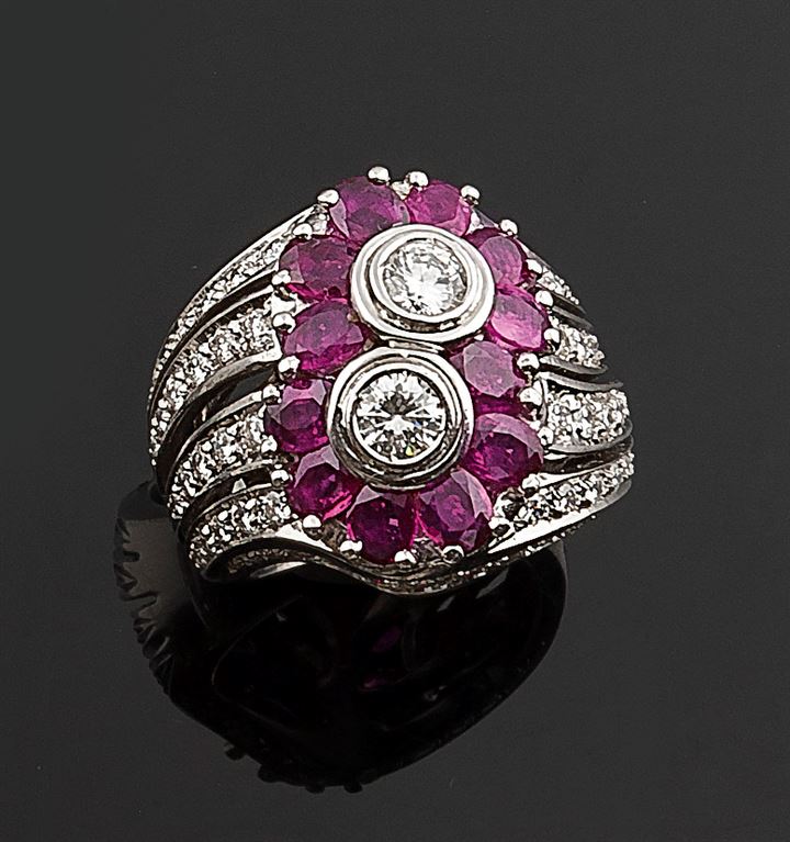Anello in oro bianco, sommità con due fiori intrecciati, con diamanti taglio brillante per complessivi ct 2,0 ca e rubini taglio rotondo per complessivi ct 3,0 ca