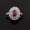 Anello in oro bianco con al centro rubino taglio ovale e doppio contorno di diamanti taglio brillante per complessivi ct 0,75 ca