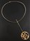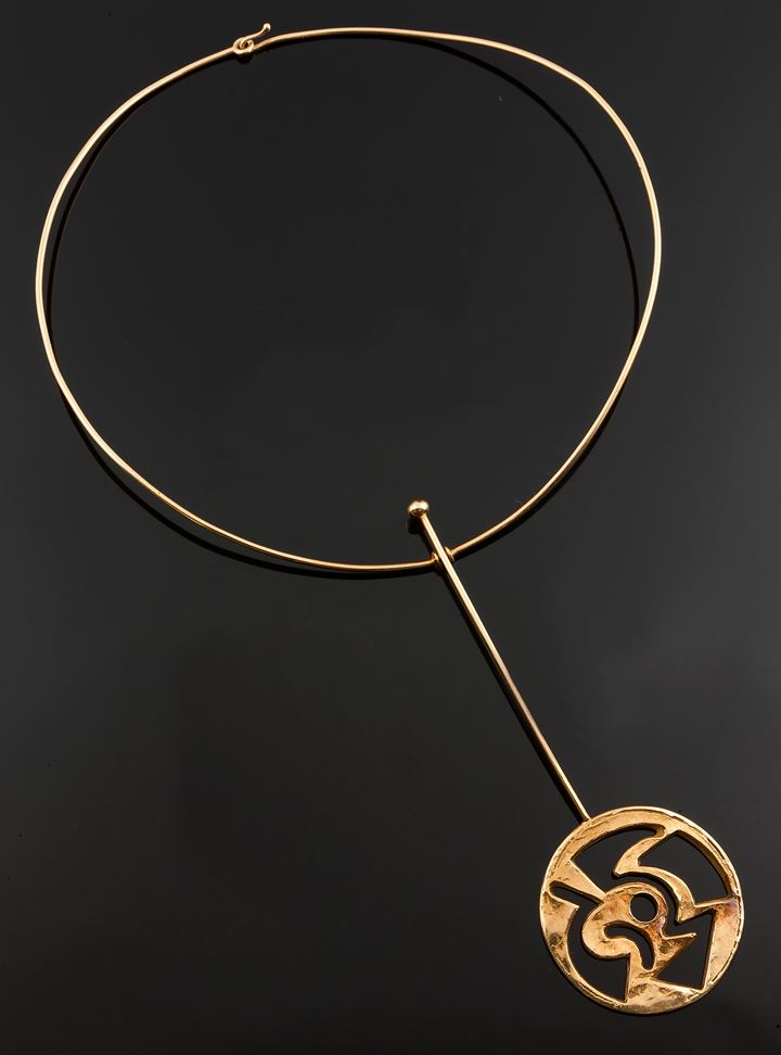 Girocollo rigido in oro giallo con ciondolo pendente , firmato "Mastroianni", di forma tonda, lavorato a motivi astratti. Pezzo unico