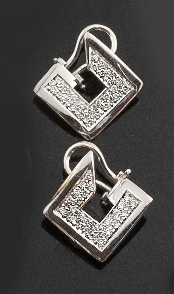 Coppia di orecchini in oro bianco, di forma quadrata, con diamanti taglio brillante per complessivi ct 0,50 ca