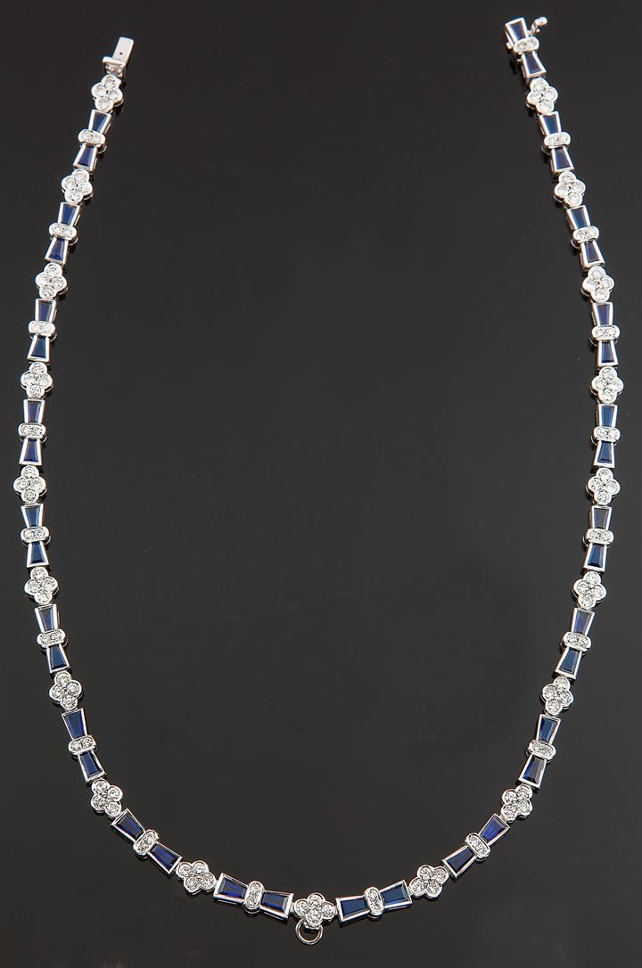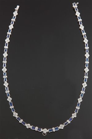 Girocollo in oro bianco composto da zaffiri taglio fantasia e diamanti taglio brillante disposti a fiore per complessivi ct 5,5 ca