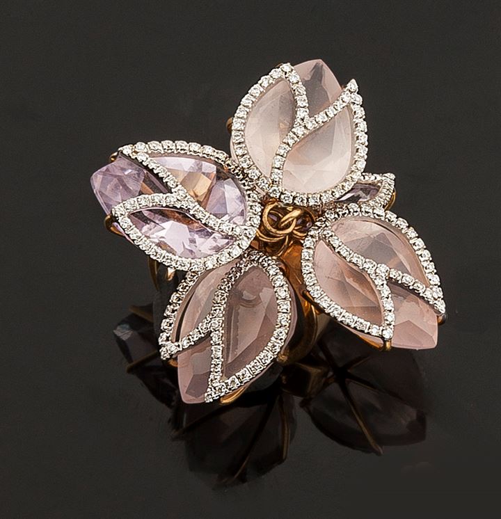 Anello in oro giallo con sommità composta da cinque quarzi taglio a goccia mobili a simulare dei boccioli di rosa stilizzati, con diamanti taglio brillante per complessivi ct 0,40 ca