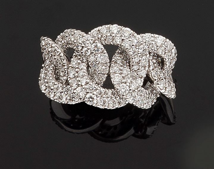 Anello in oro bianco, sommità lavorata a maglia groumette mobile, interamente in diamanti taglio brillante per complessivi ct 2,40 ca