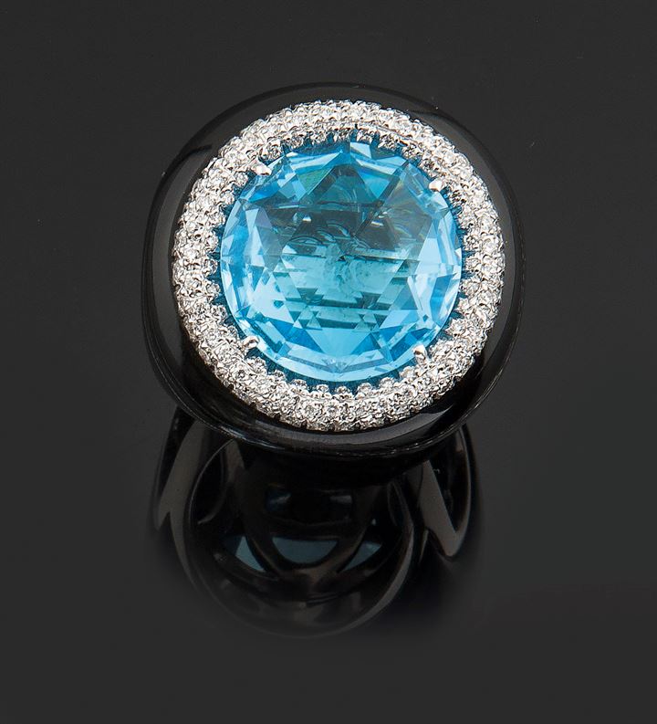 Anello in oro bianco, sommità in onice, con al centro grande topazio sfaccettato circondato da diamanti taglio brillante per complessivi ct 1,0 ca