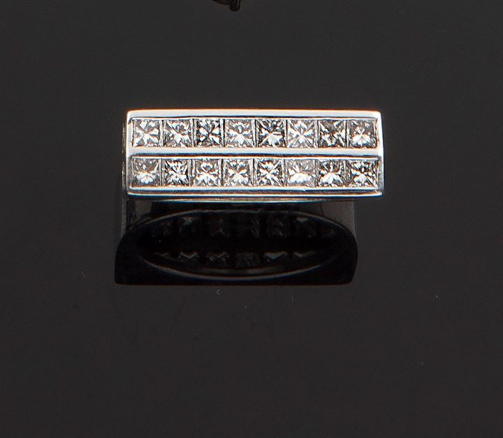 Anello in oro bianco, sommità piatta, recante due file di diamanti taglio princess per complessivi ct 1,50 ca