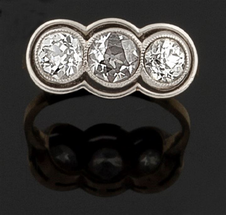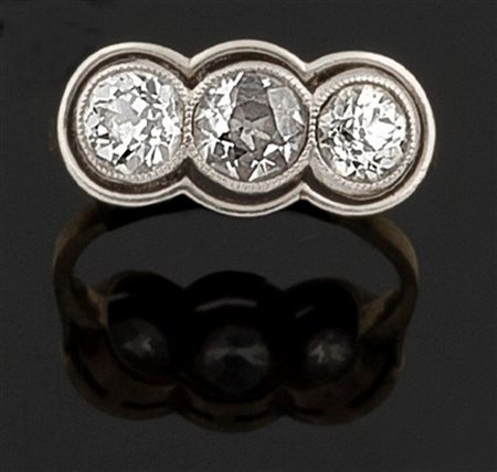 Anello in oro giallo e argento sommità con tre diamanti taglio brillante di vecchio taglio per complessivi ct 1,70 ca