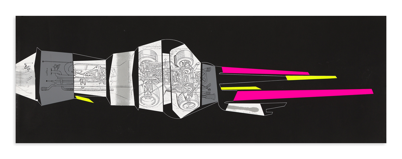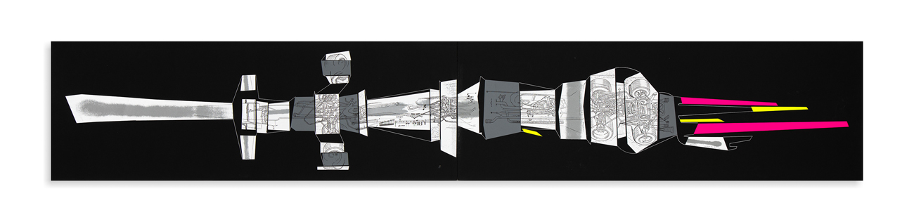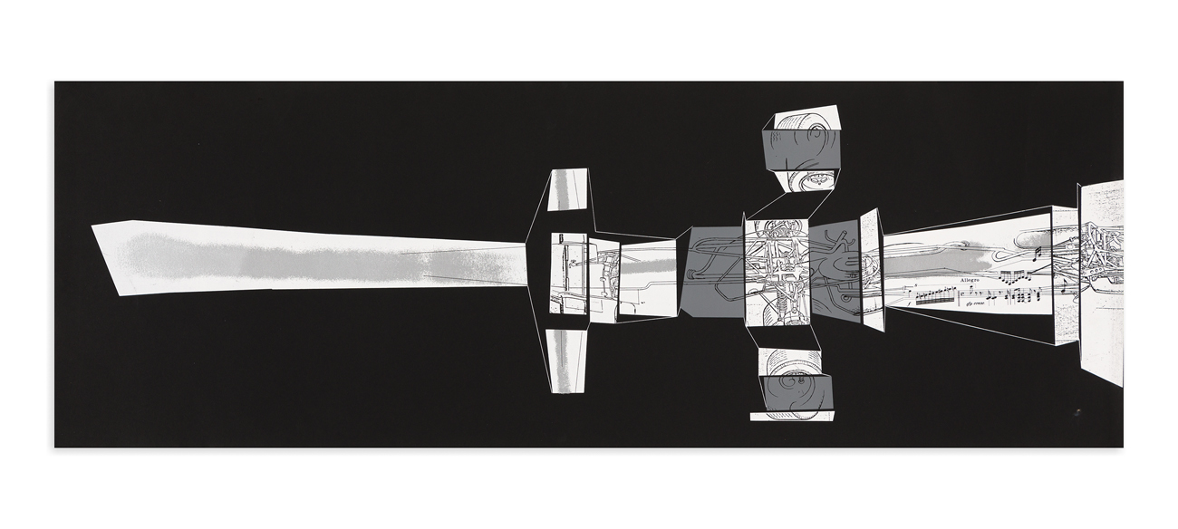 Serigrafia con collage composta da due fogli pieghevoli in cartoncino nero
