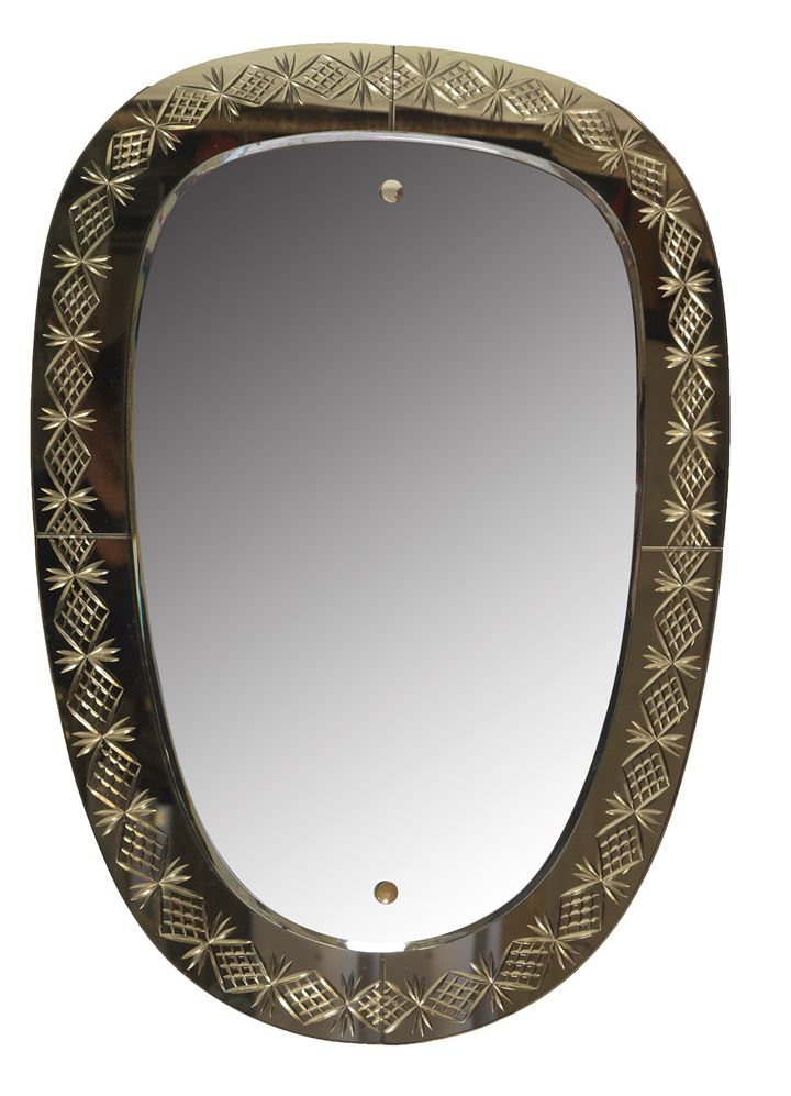 Specchiera con cornice composta da quattro elementi in vetro ambra specchiato decorato con incisioni a mola.