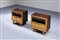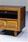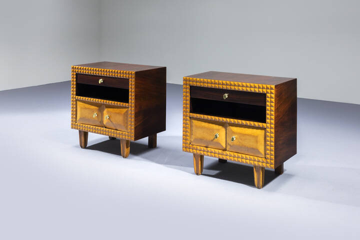 Coppia di comodini in legni di varie essenze, cornice in legno scolpito.