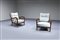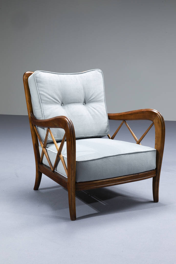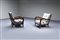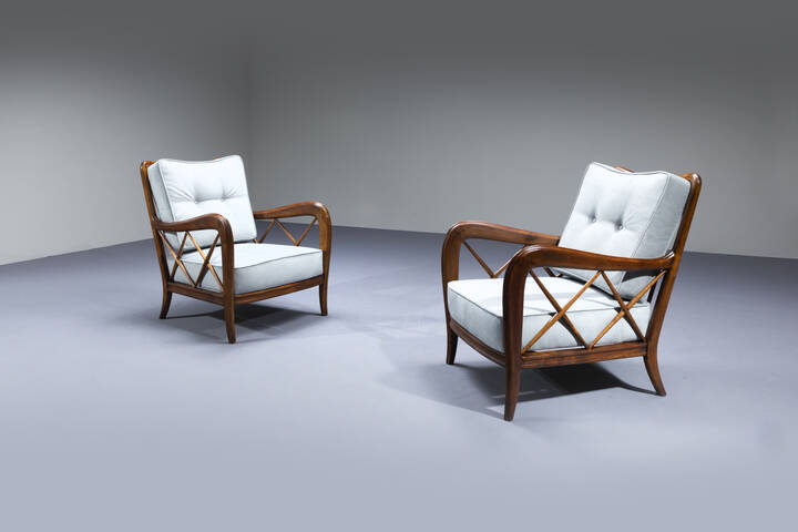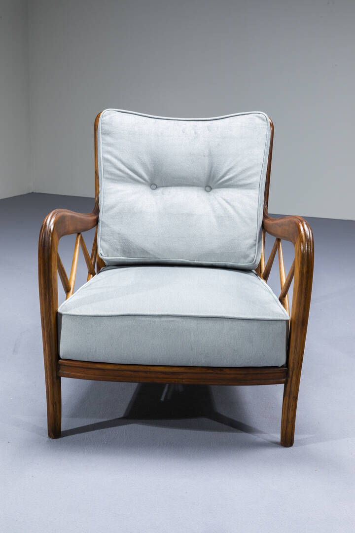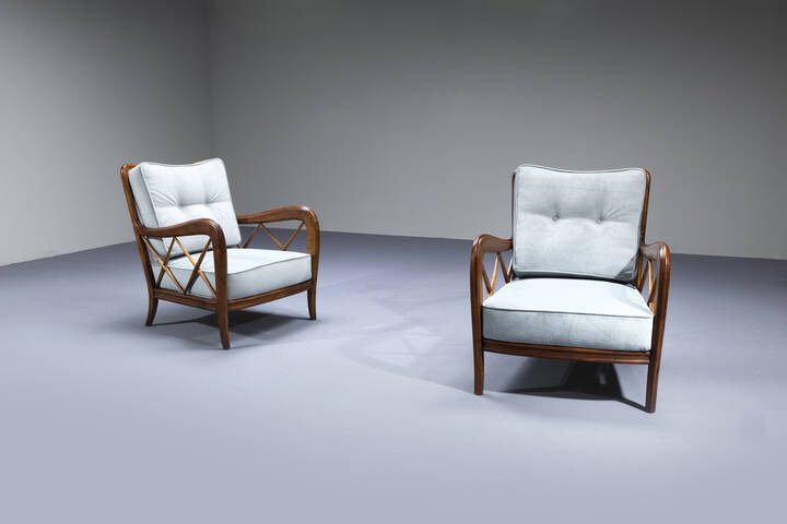 Coppia di poltrone con struttura in legno, cuscini imbottiti rivestiti in velluto.