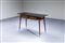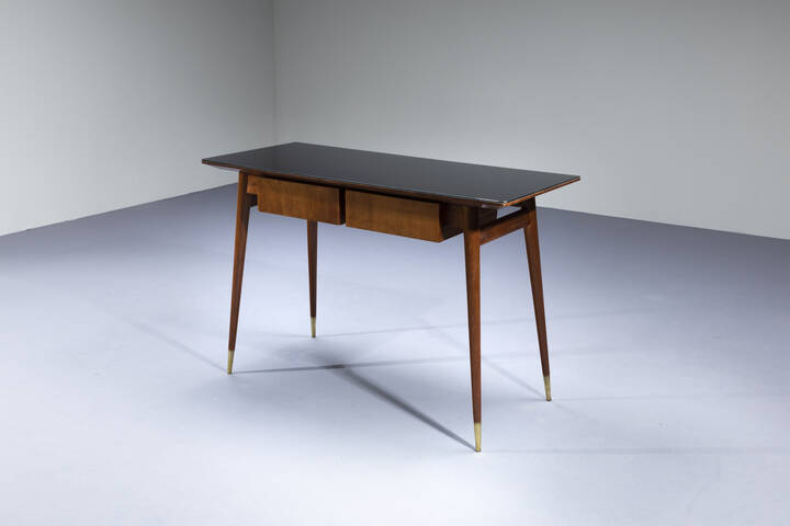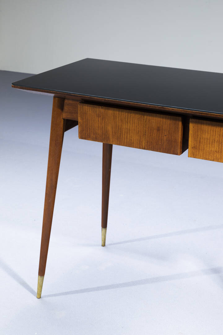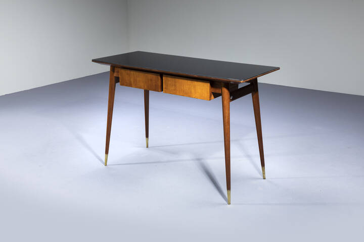 Console con due cassetti, struttura in legno, piano in vetro, puntali in ottone.