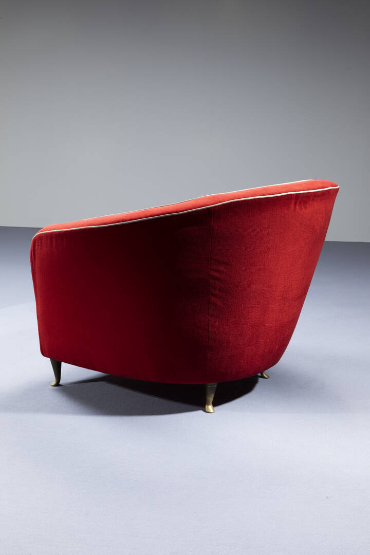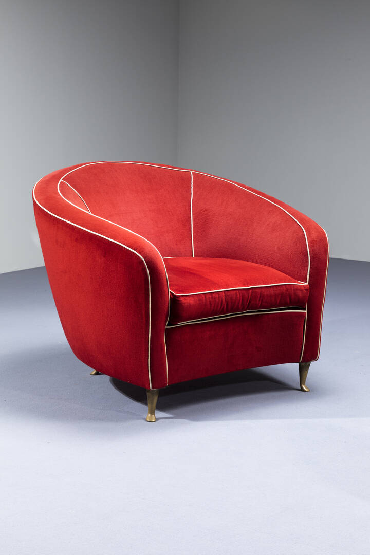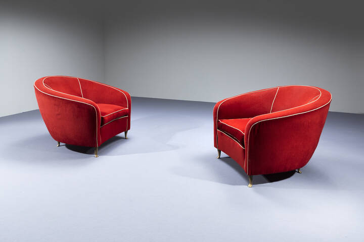 Coppia di grandi poltrone con struttura in legno e rivestimenti in velluto , piedi in ottone.