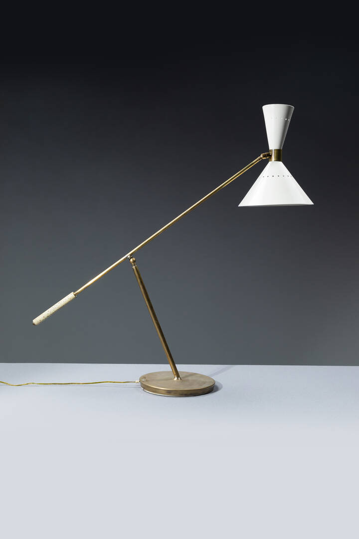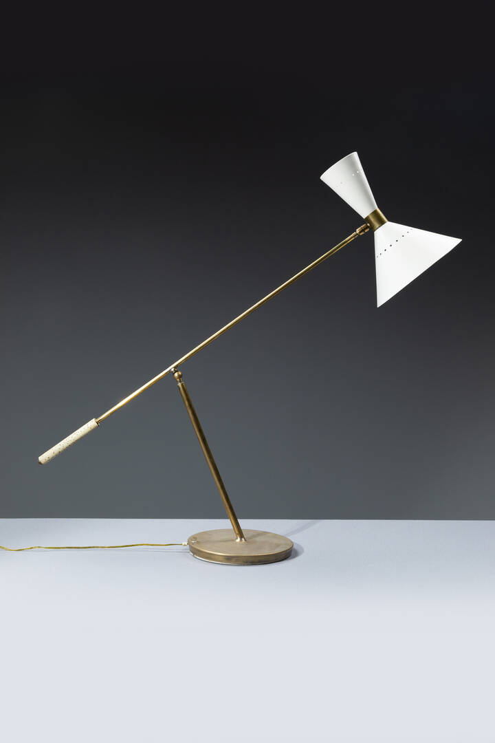 Lampada da terra in metallo verniciato e ottone, diffusore regolabile a doppio cono.