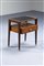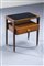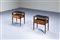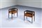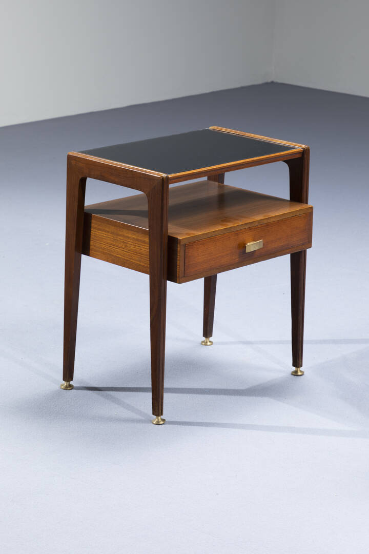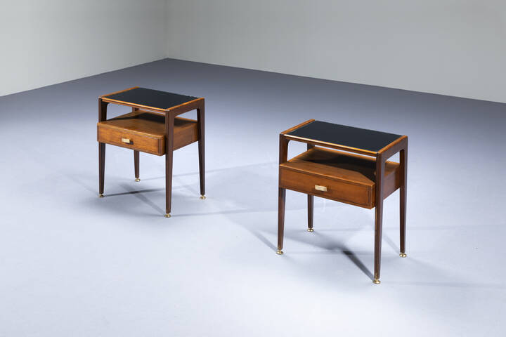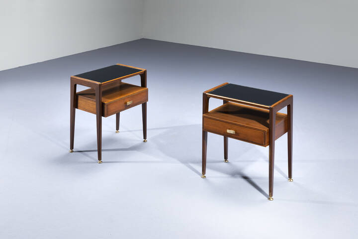 Coppia di comodini in legno di noce, piani in vetro fumé, puntali in ottone.