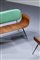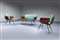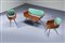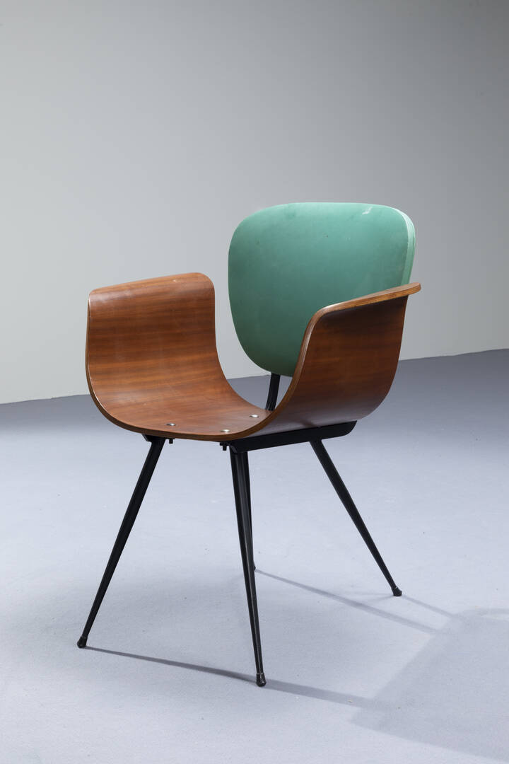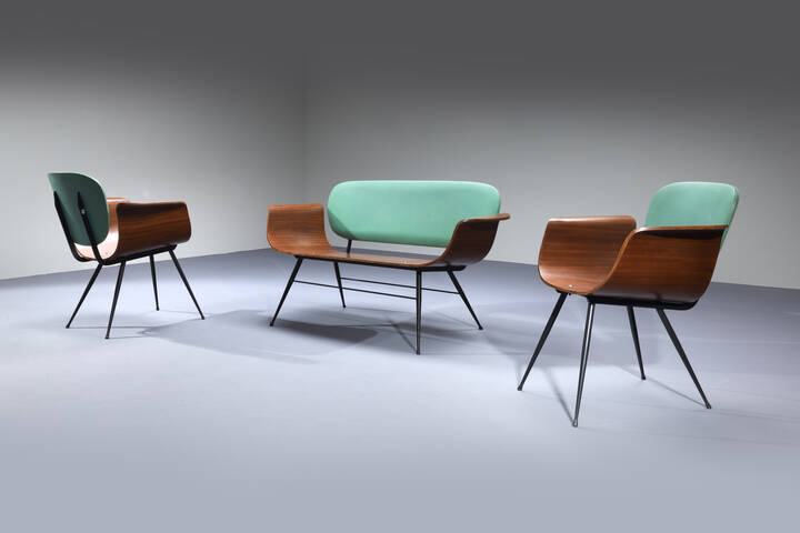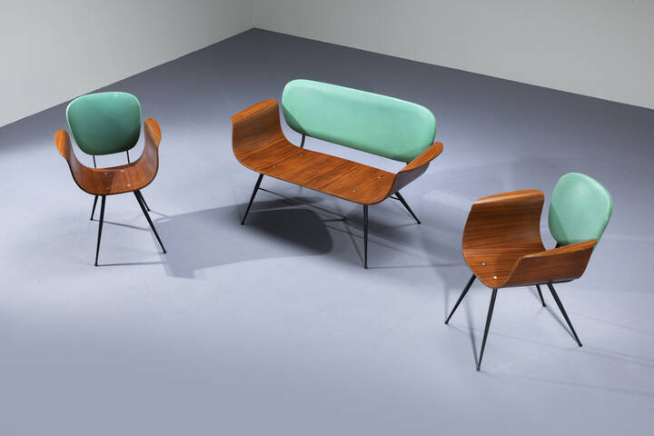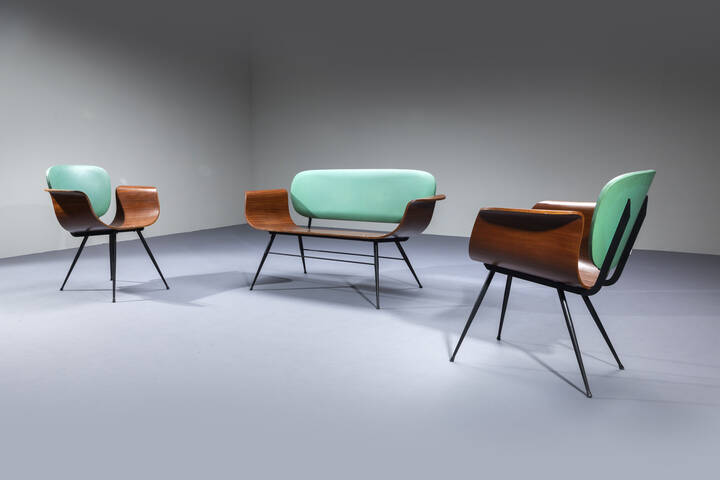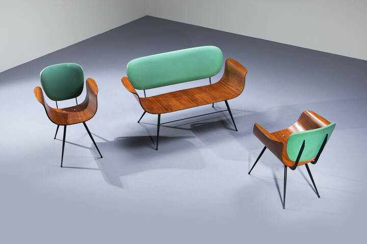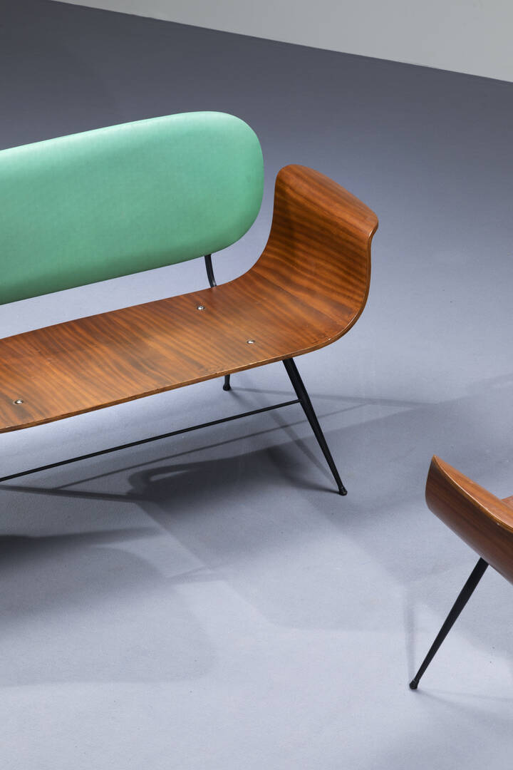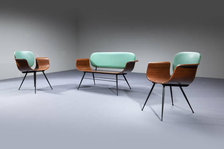 Salotto composto da un divanetto e due poltrone in metallo verniciato, compensato curvato, schienale imbottito rivestito in skai verde.