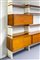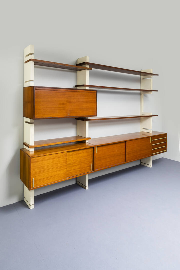 Libreria con montanti in legno laccato, moduli in legno con particolari in ottone.