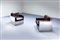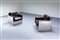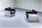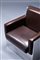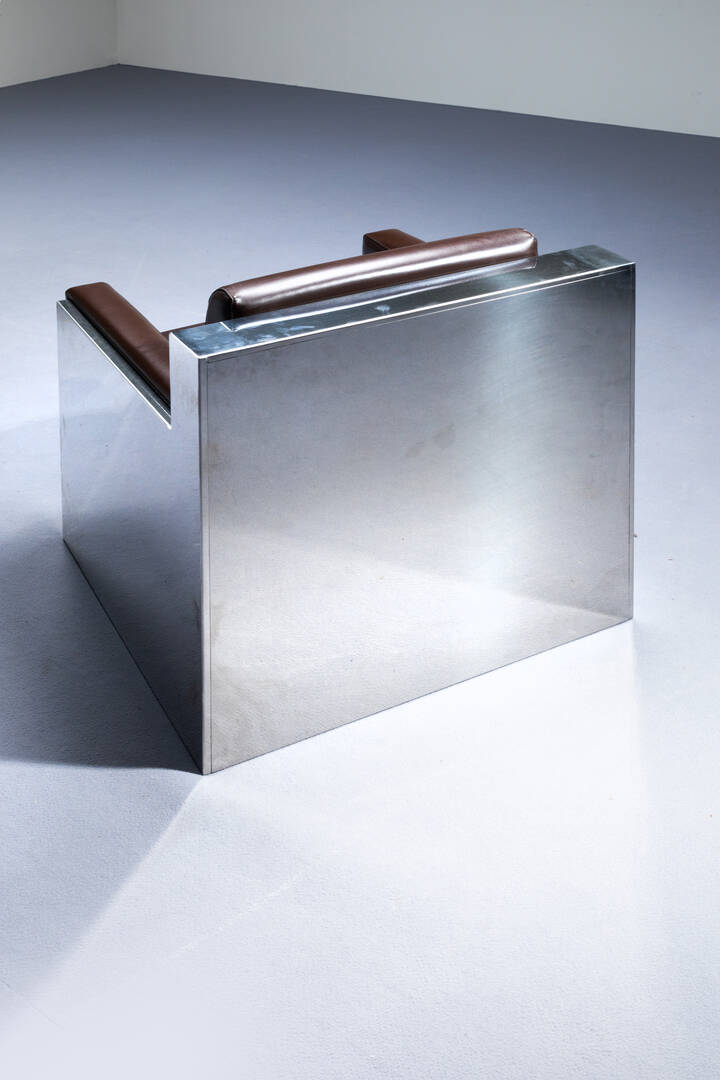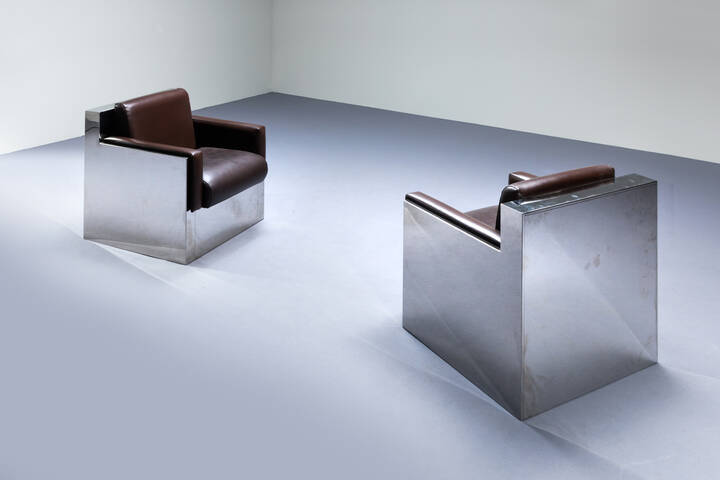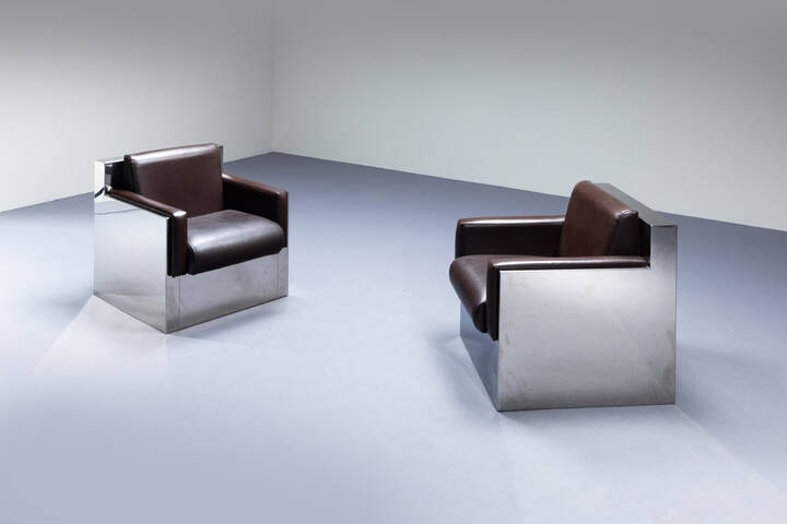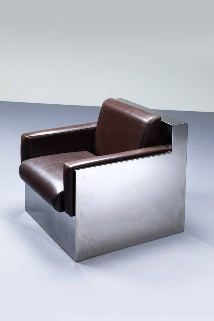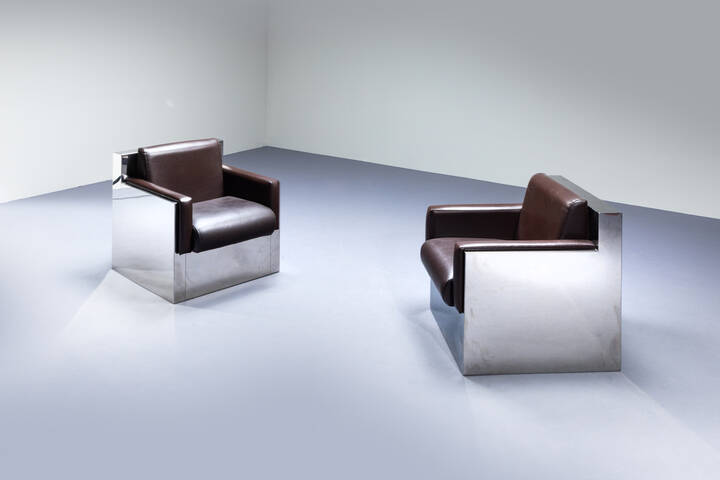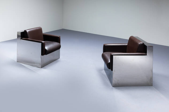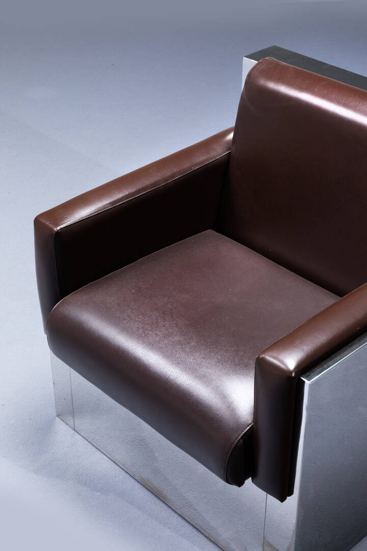 Coppia di poltrone con struttura in acciaio, cuscini imbottiti rivestiti in skai.