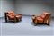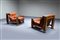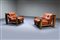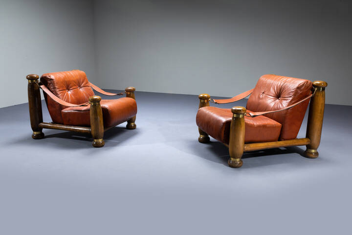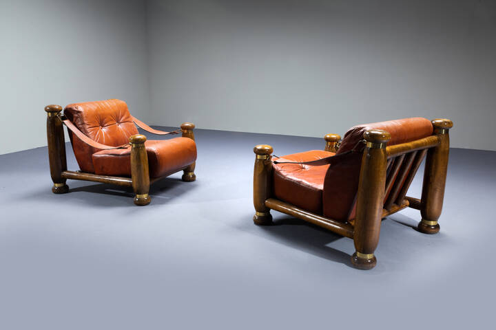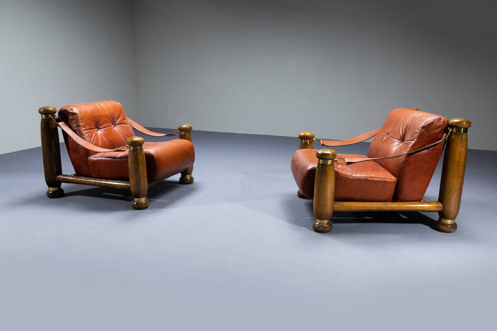 Coppia di poltrone con struttura in legno chiaro, particolari in ottone, cuscini imbottiti rivestiti in pelle.