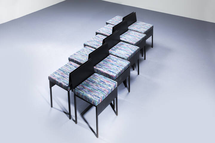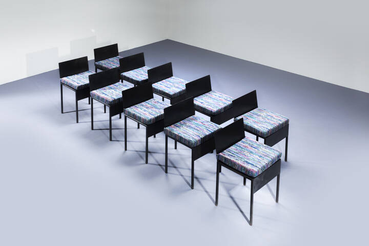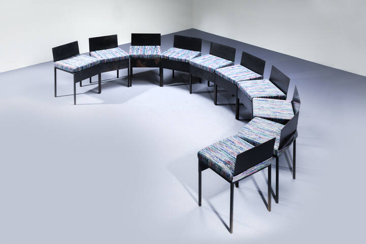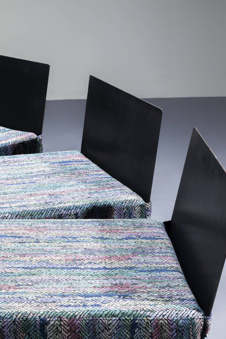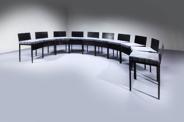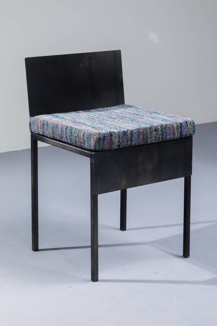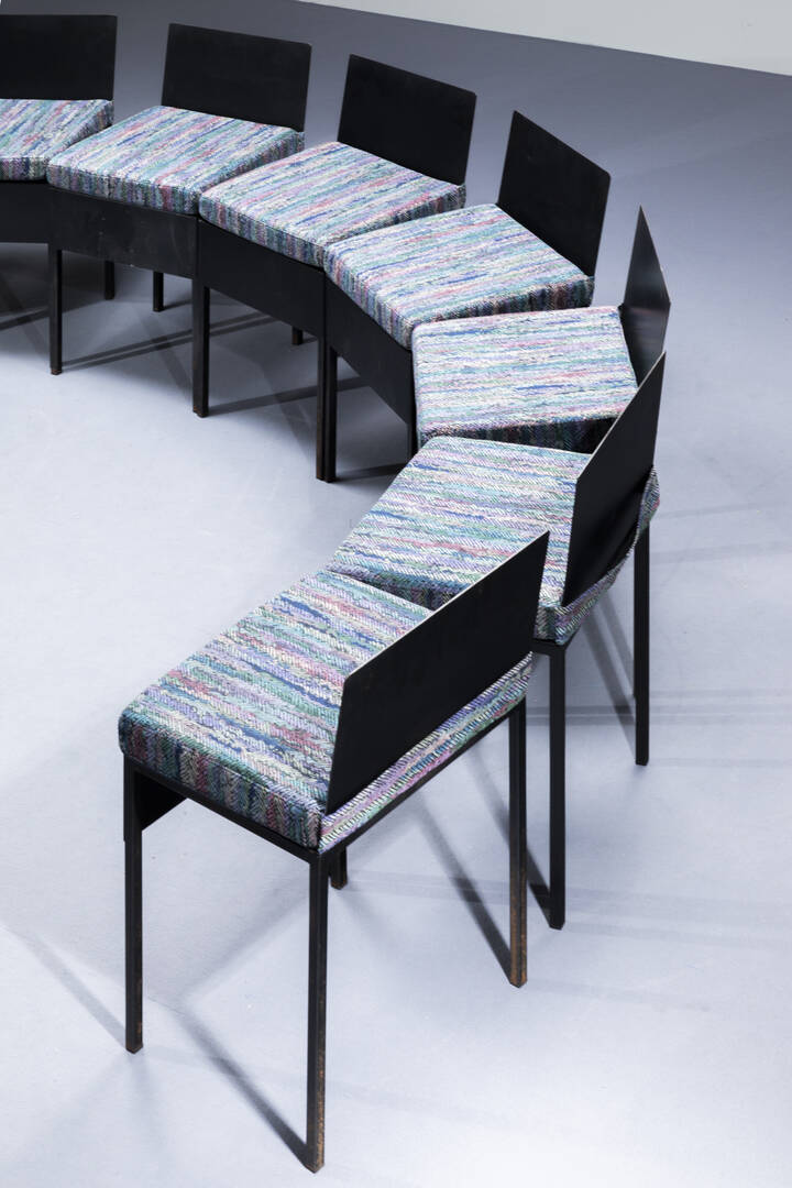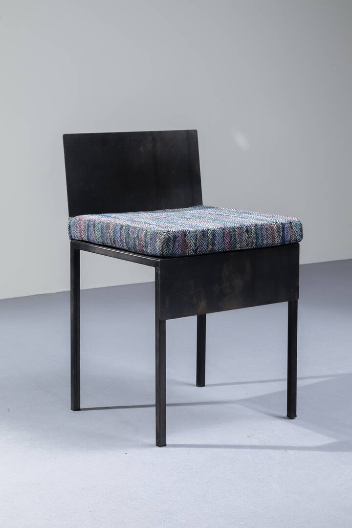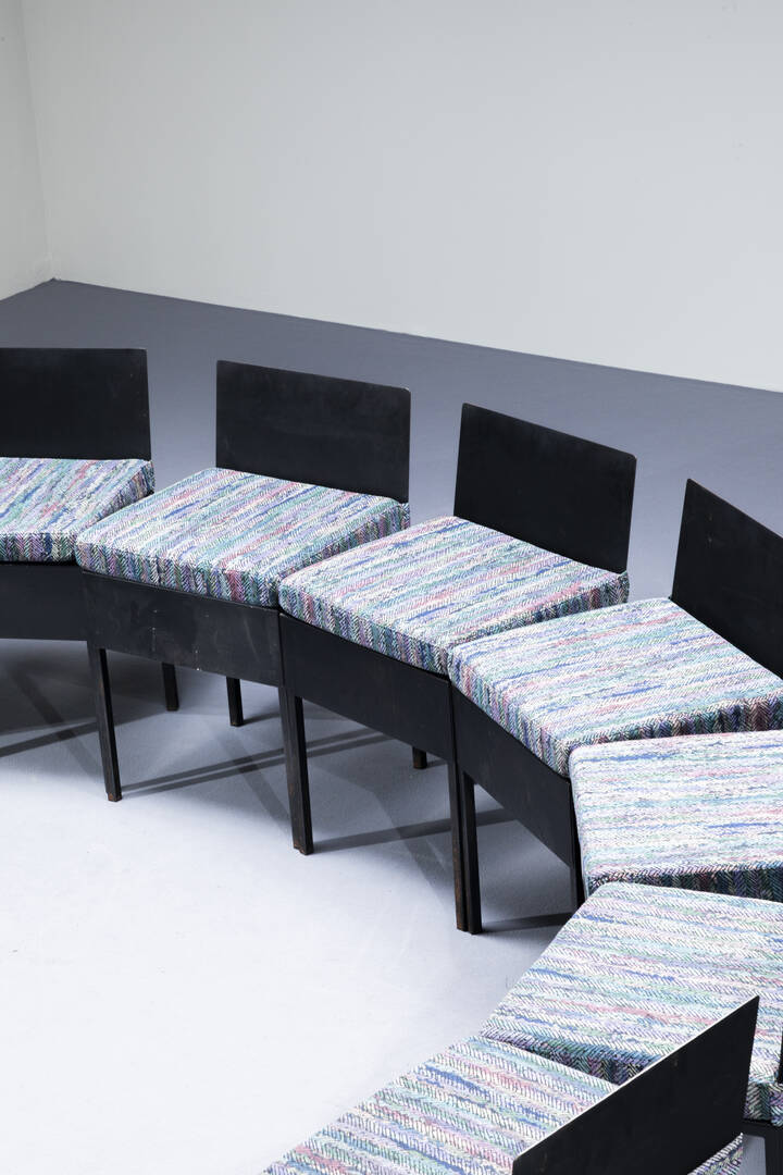 Dieci sedie con struttura in ferro verniciato, cuscini imbottiti rivestit con tessuto Missoni.