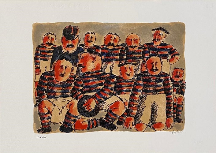 "Calciatori" Litografia su carta 35x50 cm firmata in basso a destra es. LXXVI/C. Timbro a secco Arte Fidia, Roma in basso a sinistra; Timbro a secco Franz Borghese in basso a destra. Etichetta al verso Galleria d'Arte il Gianicolo, Perugia. In cornice