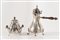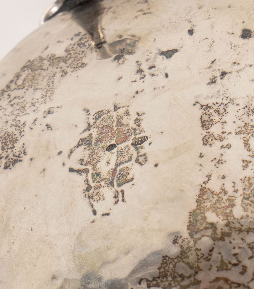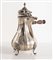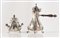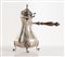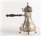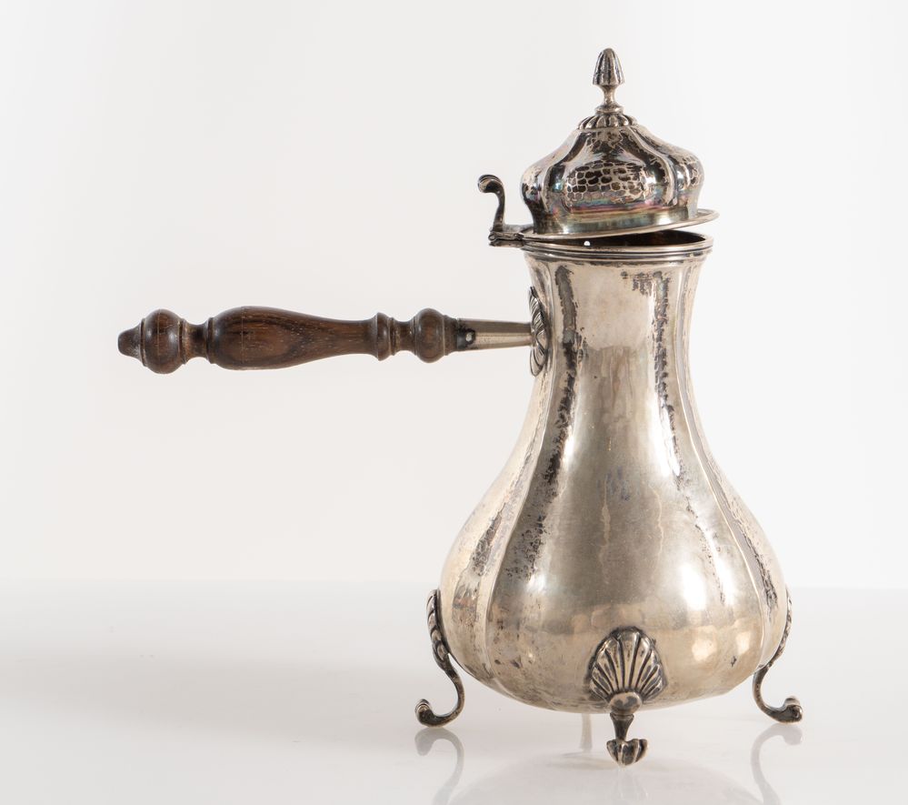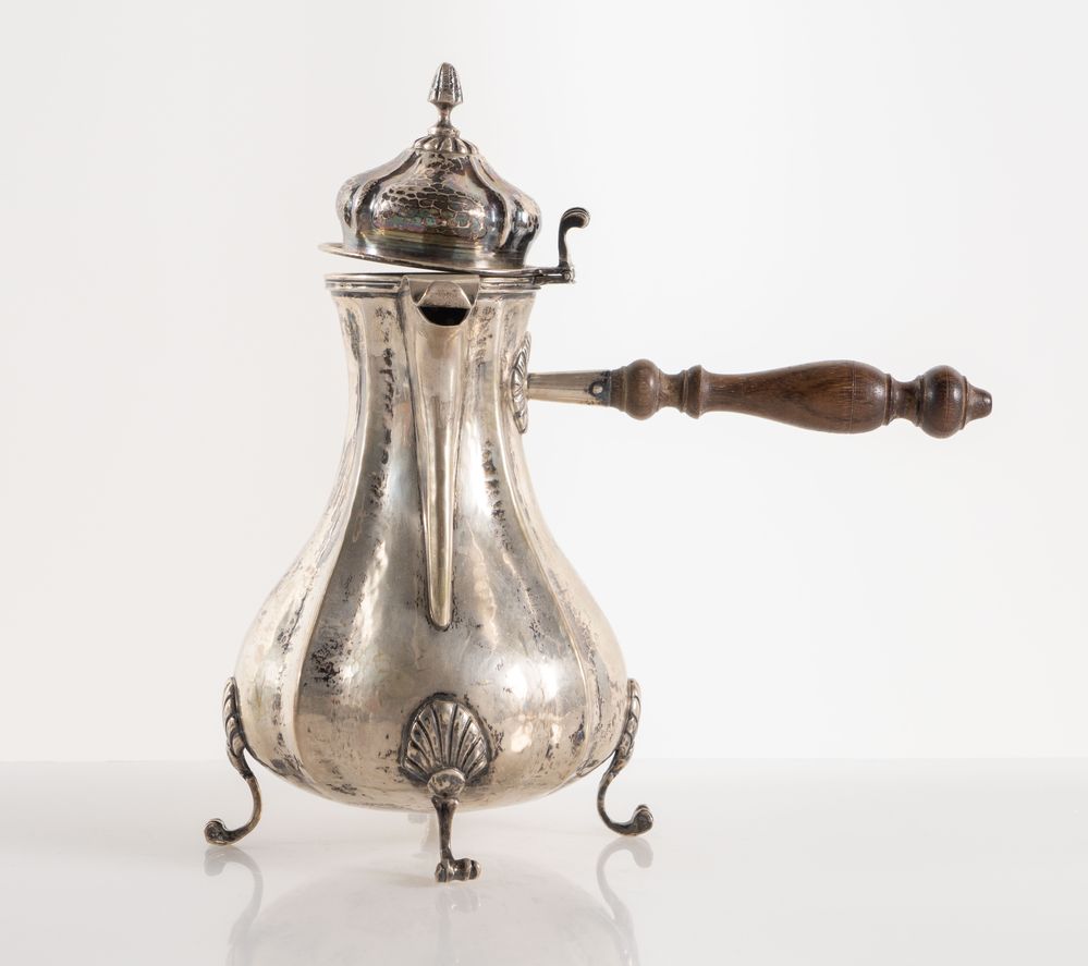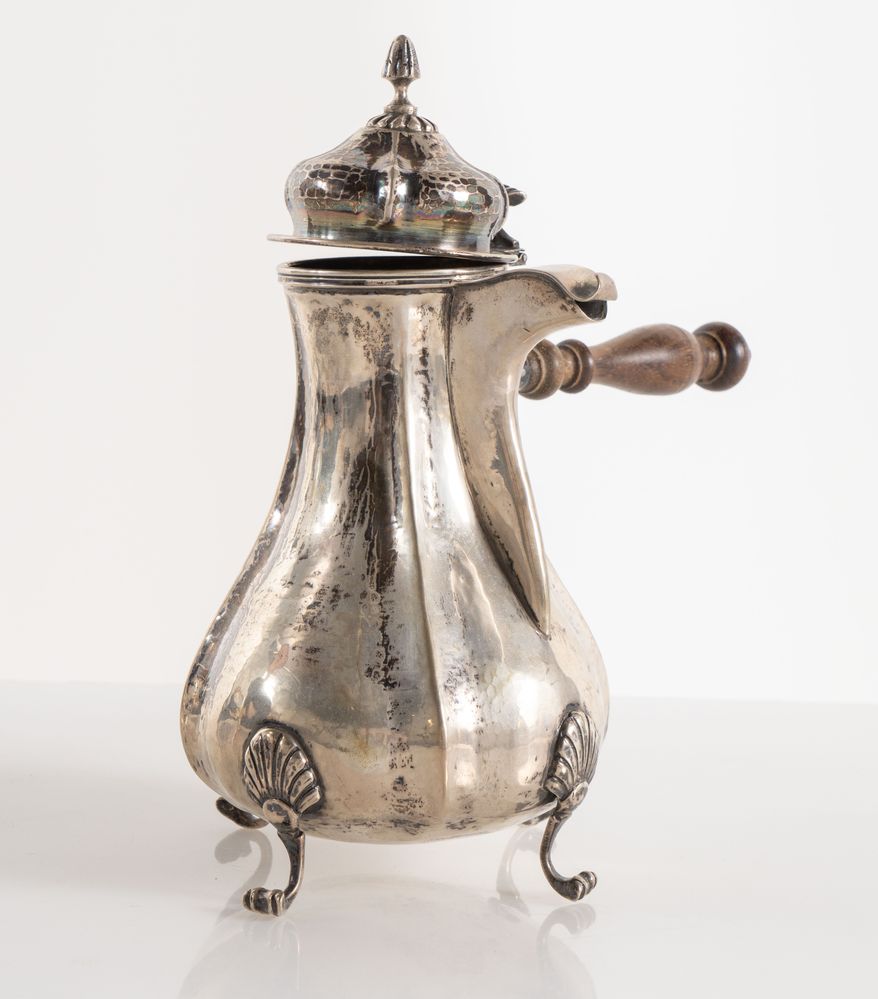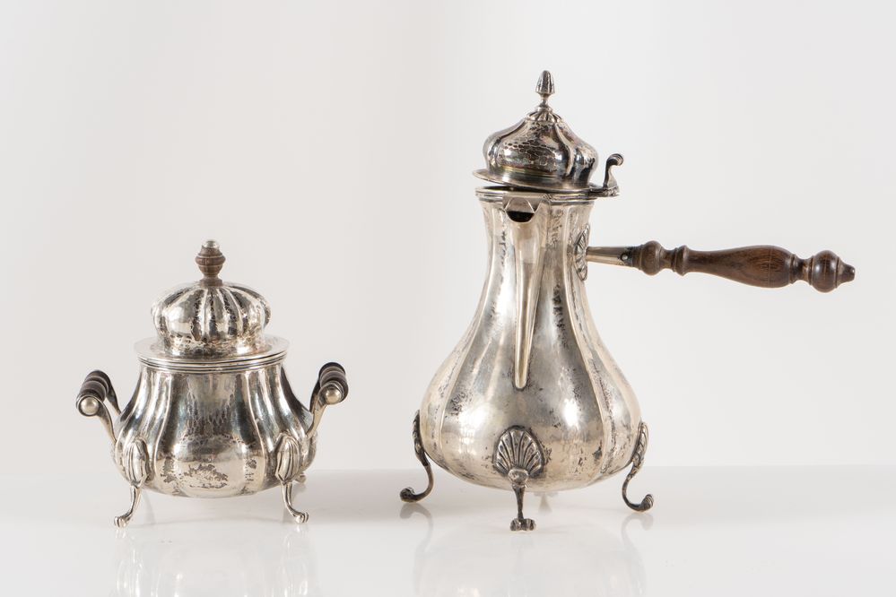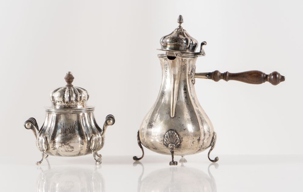 ROSSI & ARCANDI S. n. c., Vicenza, metà del XX secolo. Lotto composto da cioccolatiera e zuccheriera in argento 800, con manici lignei. Sotto la base recano punzoni: 800 e losanga locativa 266VI. Rispettivamente di cm 23x21x12 e cm 14x14x10,5. Peso complessivo: 800 gr.
