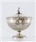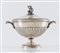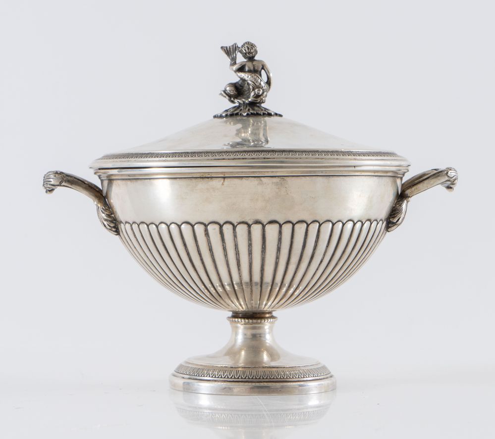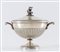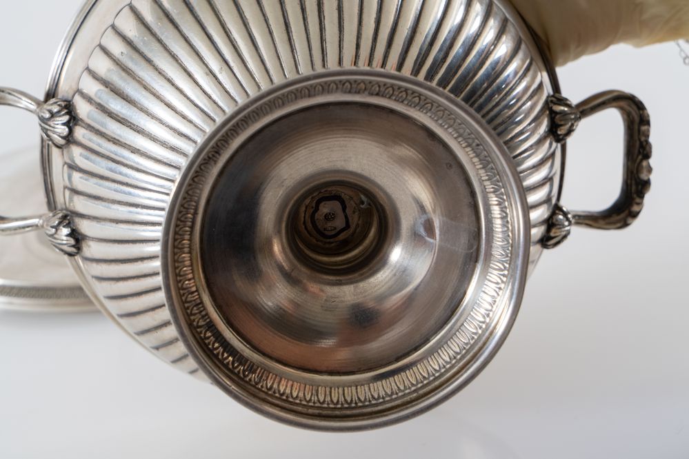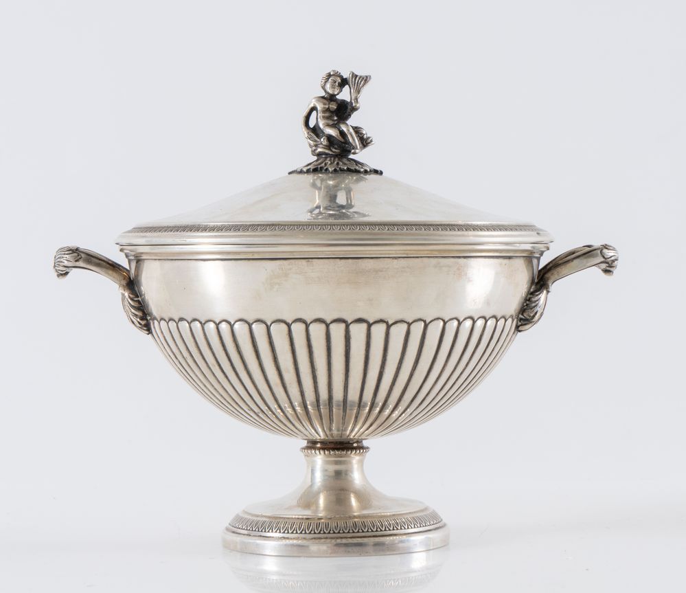Milano, prima metà del XX secolo. Zuppiera in argento 800 con manico a guisa...