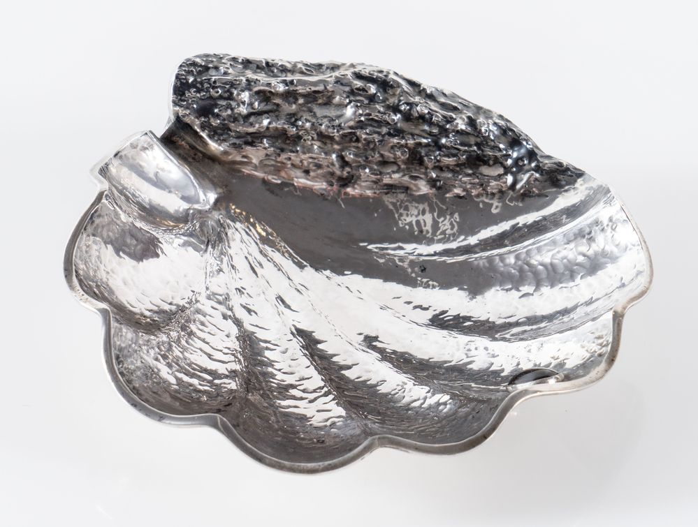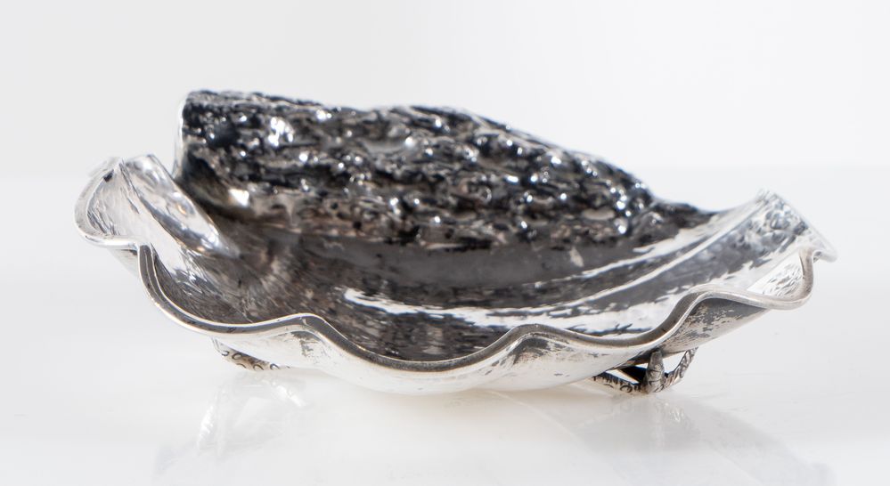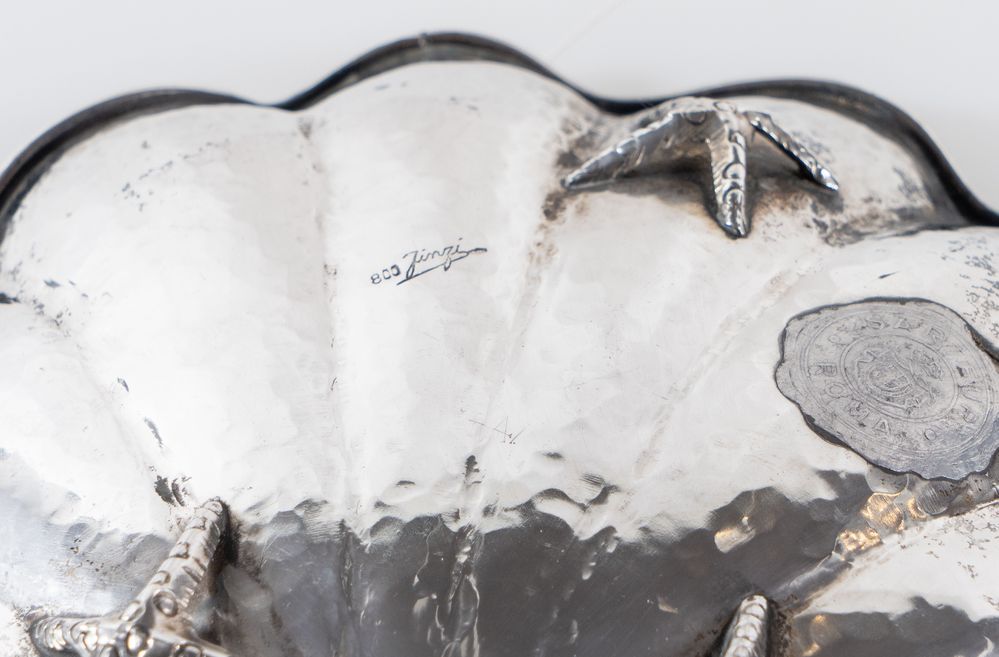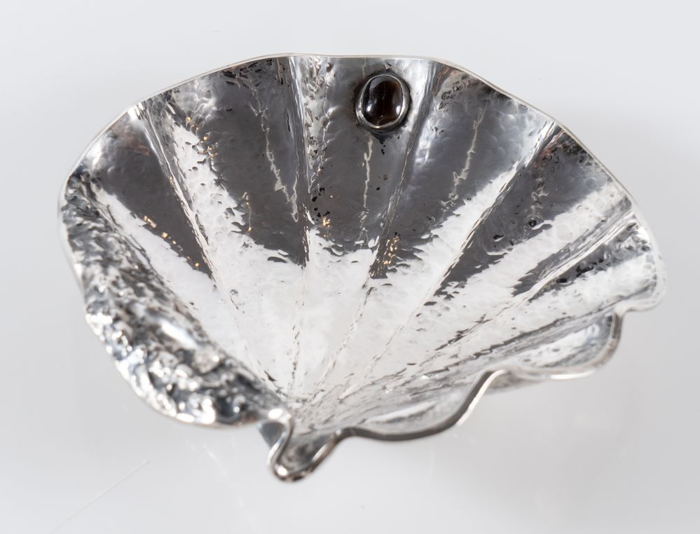 ARRIGO FINZI, Milano, XX secolo. Svuotatasche in argento 800 a forma di conchiglia, recante pietra dura e poggiante su tre piedini a forma di stella marina. Sotto la base reca punzoni: 800, firma dell'argentiere, losanga locativa. Cm 4,5x16,5x16,5. Peso complessivo: 190 gr.