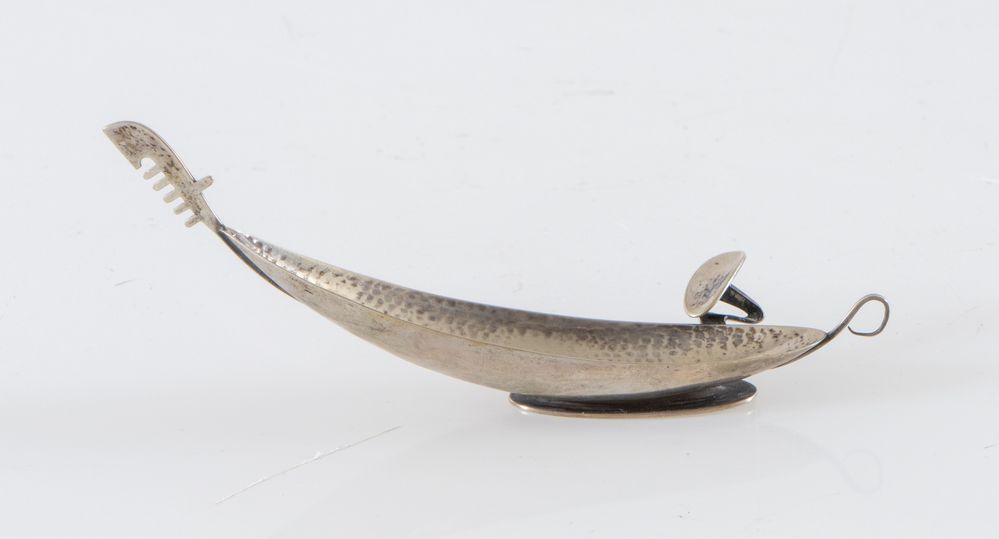 SFRISO, Venezia, XX secolo. Posacenere in argento 800 a forma di gondola. Sotto la base reca punzoni: Sfriso, Venezia, 800. Cm: 5.7x14,5x4,5. Peso: 34 gr.