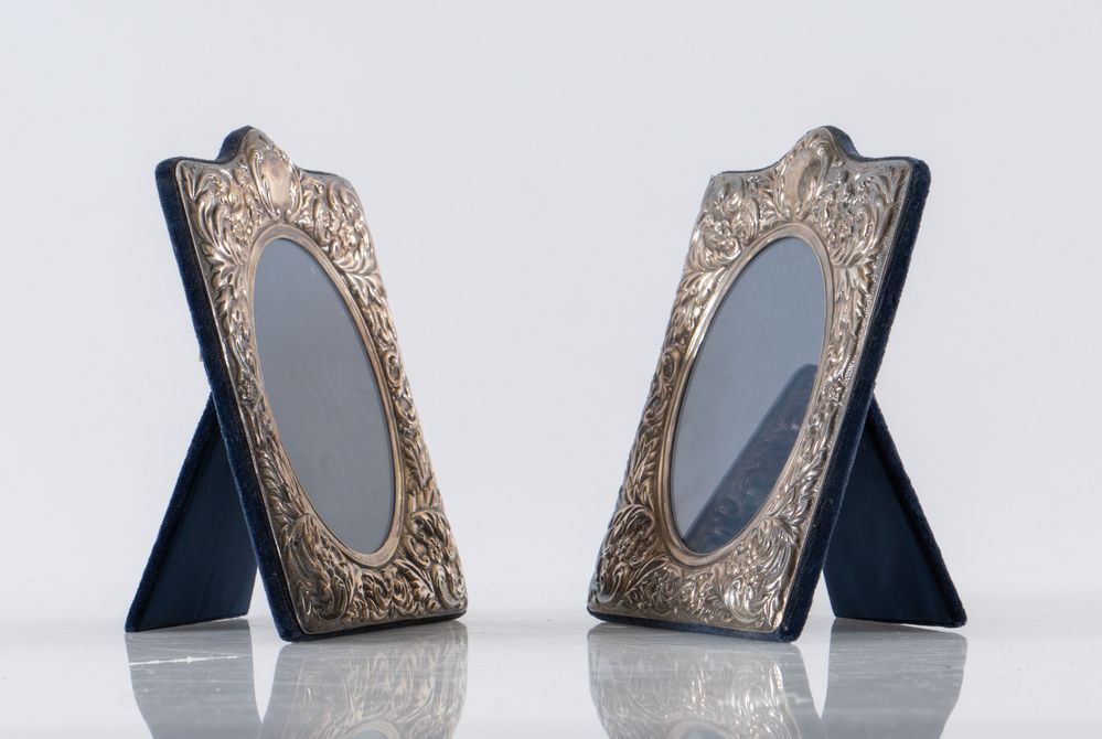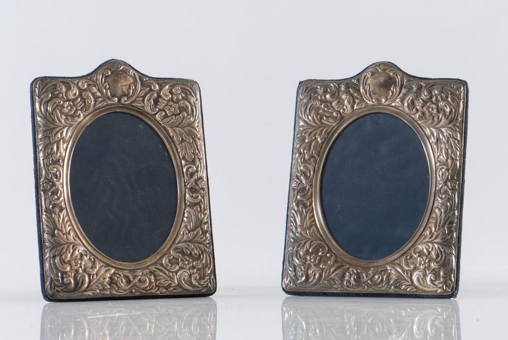 Londra, 1991. Coppia di cornici in argento 925. John Bull Ltd, Londra, 1991. Cornice in argento 925. Al fondo reca punzoni: JBLD, leone, punzone londinese, lettera dataria R. Cm 19x14x9(aperta). Argentiere DRS, Londra, 1991. Cornice in argento 925. Al fondo reca punzoni: DRS, leone, punzone londinese, lettera dataria R. Cm 19x14x9(aperta).