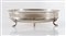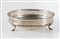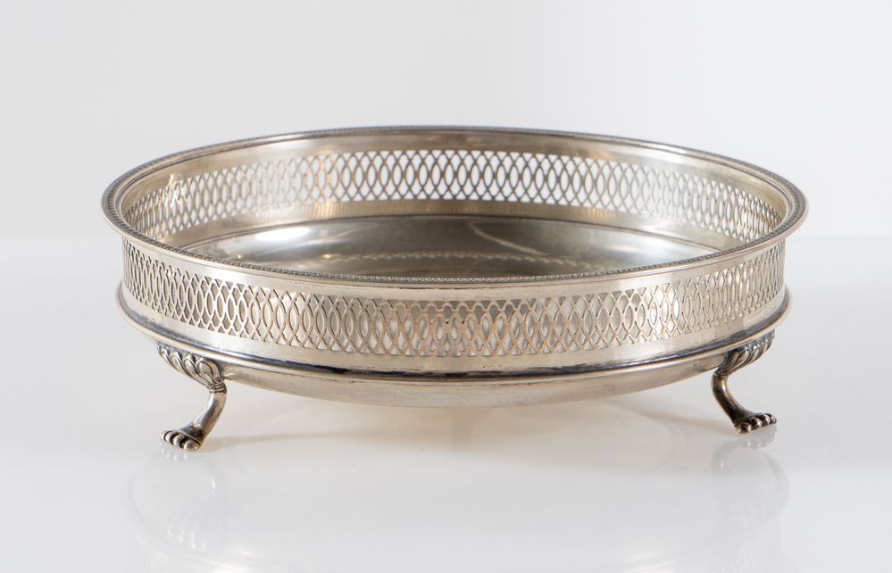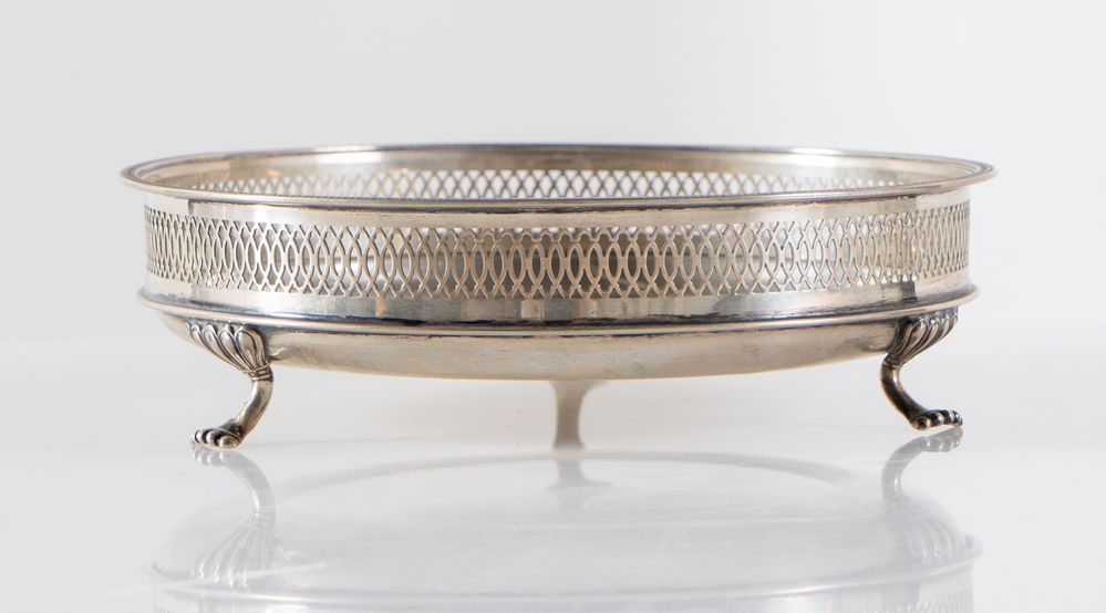 Italia, XX secolo. Alzata in argento 800 con bordo traforato a ringhiera, poggiante su tre piedi felini. Sul bordo inferiore reca punzoni: 800 e losanga locativa non identificata. Cm 5x18,5. Peso: 265 gr.