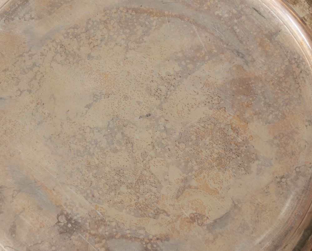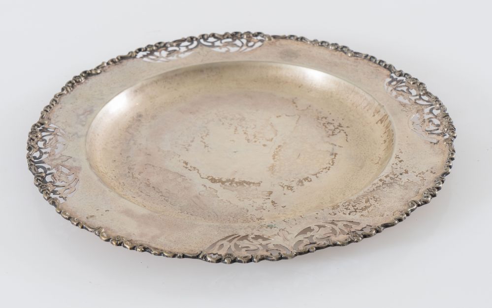 Italia, XX secolo. Piatto con bordo decorato in argento 800. Sotto la base reca punzoni: 800 e losanga locativa non identificata. Diametro: cm 28,3. Peso: 371 gr.