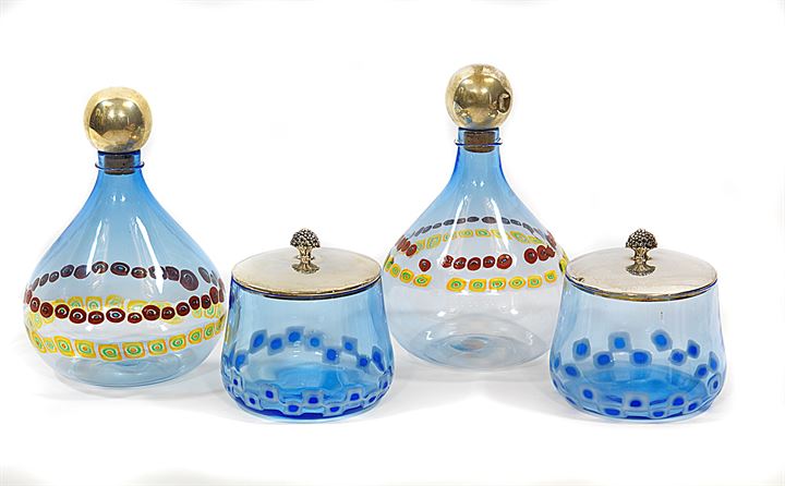 Due bottiglie e due vasi in vetro soffiato con inclusioni di murrine.