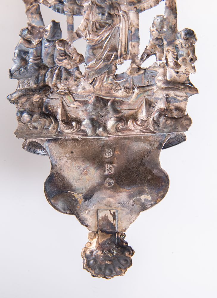 Acquasantiera in argento 800. Al retro reca punzoni in uso dal 1812 al 1872 nel Regno Lombardo-Veneto: mondo, stemma dell'argentiere e trioni e stemma di milano. Milano, Regno Lombardo Veneto, dal 1812 al 1872. Cm 20x8,5x3,5. Peso: 46 gr.