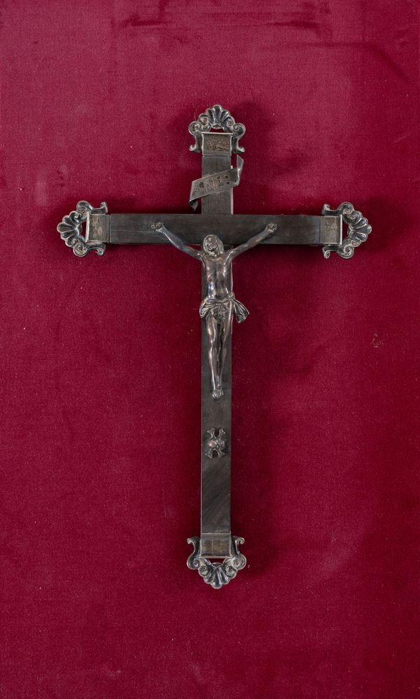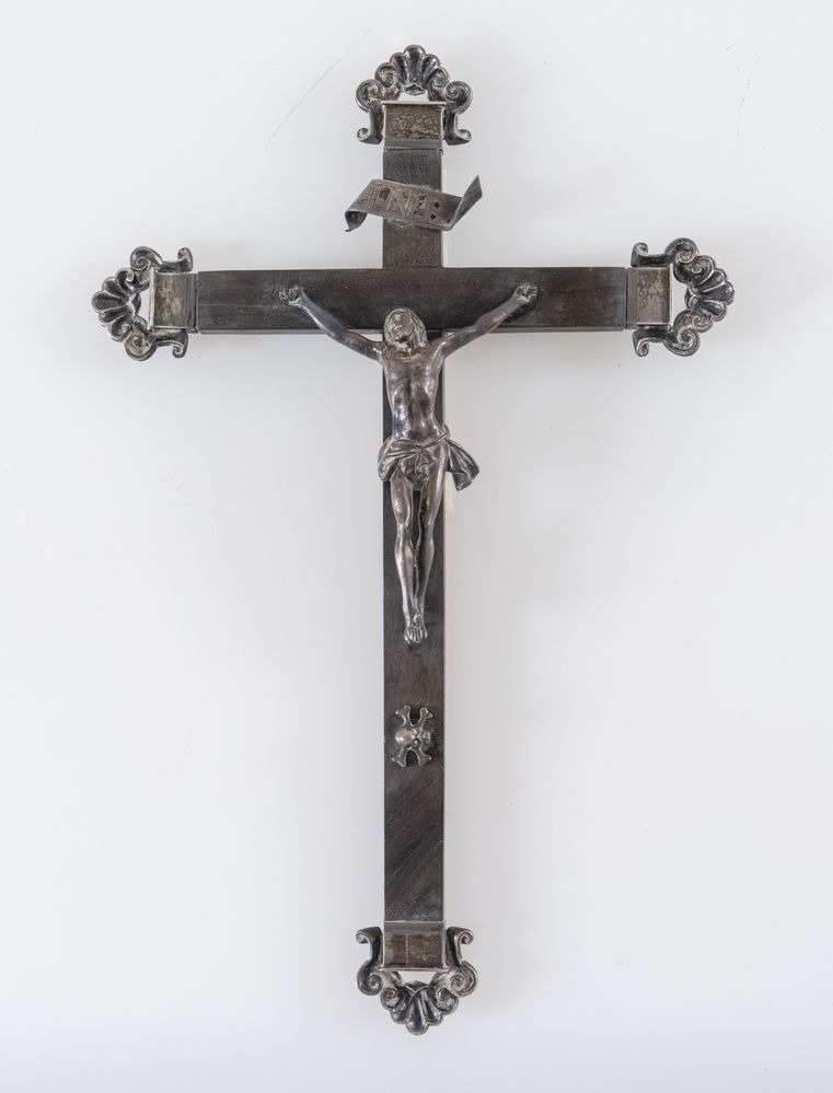 Cristo in argento ed ebano. Emilia-Lombardia, metà del XVIII secolo. Reca figura del Cristo, puntali, memento mori e tabella inri in argento mentre la croce è in ebano. Non reca punzoni evidenti. Cm 30x20.