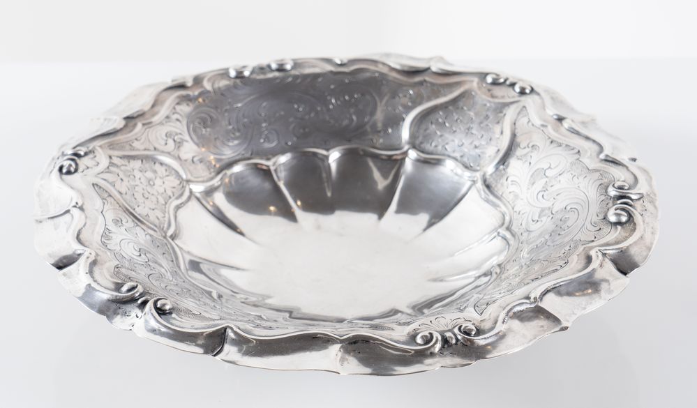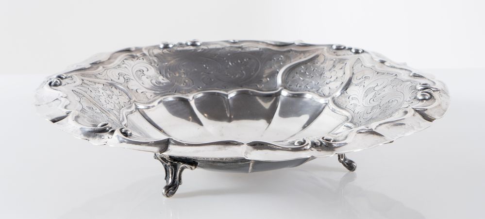 Italia, fine del XIX secolo - inizio del XX secolo. Alzata in argento 800. Sotto la base reca punzoni: stemma dell'argentiere e 800 a campo libero. Cm 6,5xdiametro 30. Peso: 499 gr.