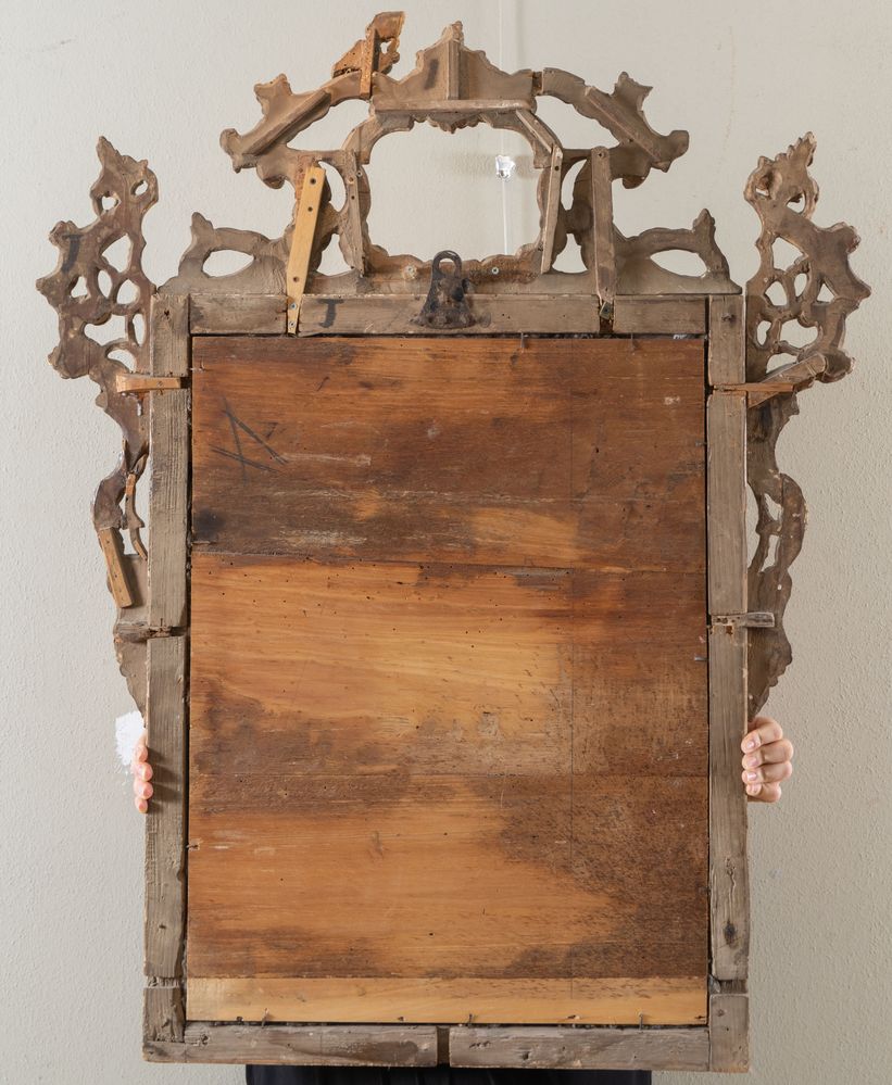 SPECCHIERA in legno intagliato e dorato. Specchio al mercurio originale. Veneto, ultimo quarto del XVIII secolo. Cm 111,5x87. (difetti e mancanze)