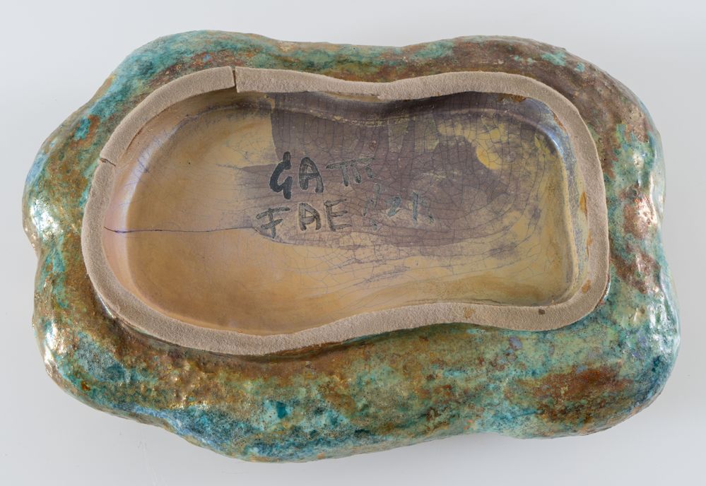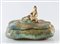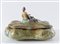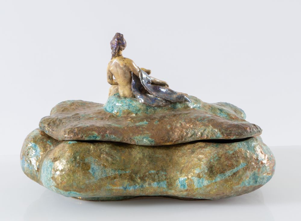BOTTEGA GATTI Ciotola in ceramica policroma a lustro sui toni dell'azzurro e dell'oro con coperchio con figura femminile e cane. Anni '60. Cm 25x36x25. Alla base firmata Gatti Faenza. (restauri al collo della figura)