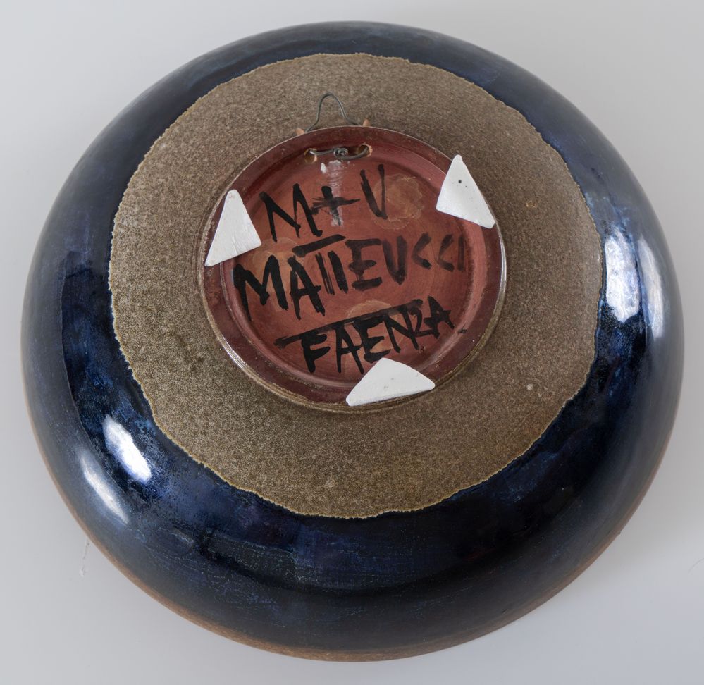 MATTEUCCI FAENZA Ciotola in ceramica policroma con interno a raggiera. Anni '50 / '60. Altezza cm 6. Diametro cm 19. Alla base reca marchio M+V Matteucci Faenza.