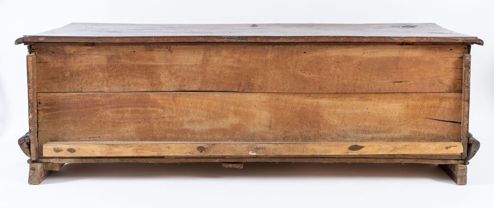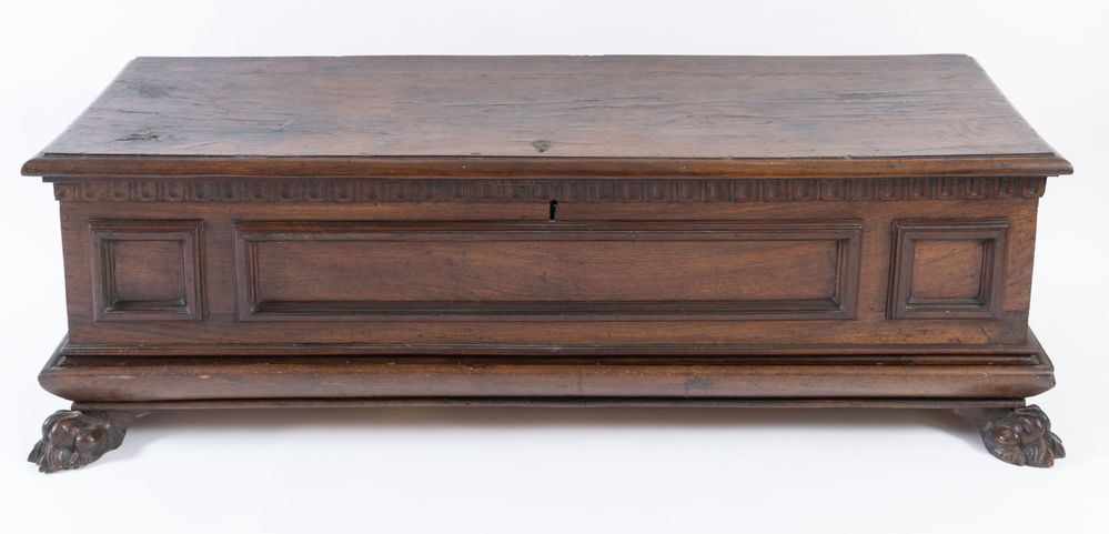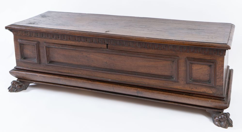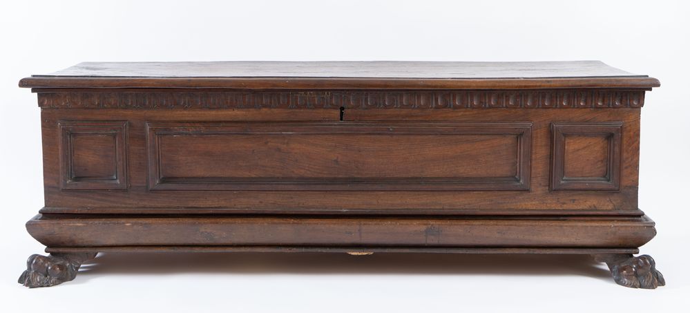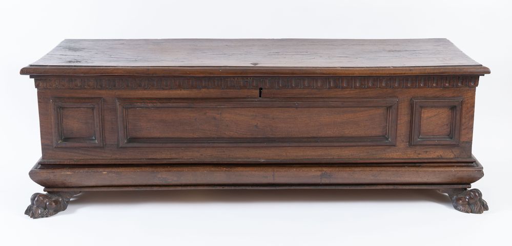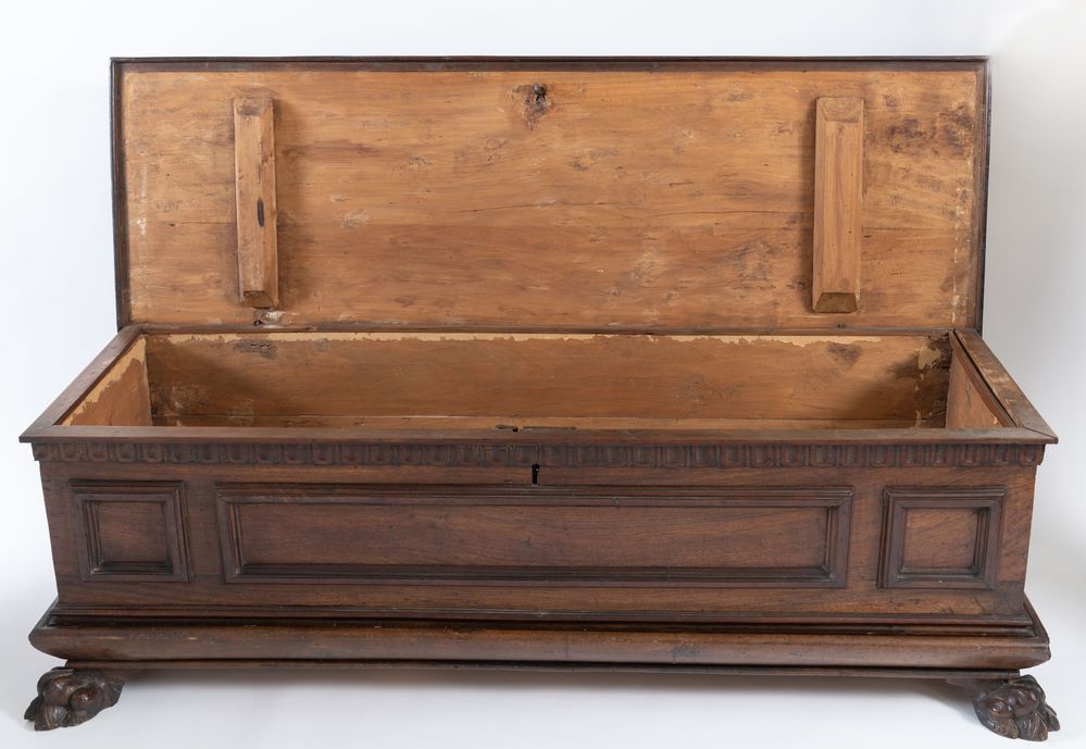 Cassapanca lastronata in massello di noce. Area Tosco-Emiliana, primo quarto del XVII secolo. Reca riquadrature profilate con cornici sul fronte, cornice unghiata sotto il coperchio e cornicione fortemente aggettante e sagomato alla base e piedi di foggia ferina di epoca successiva. Cm 57,5x176x58,5.