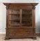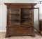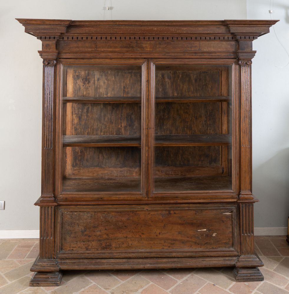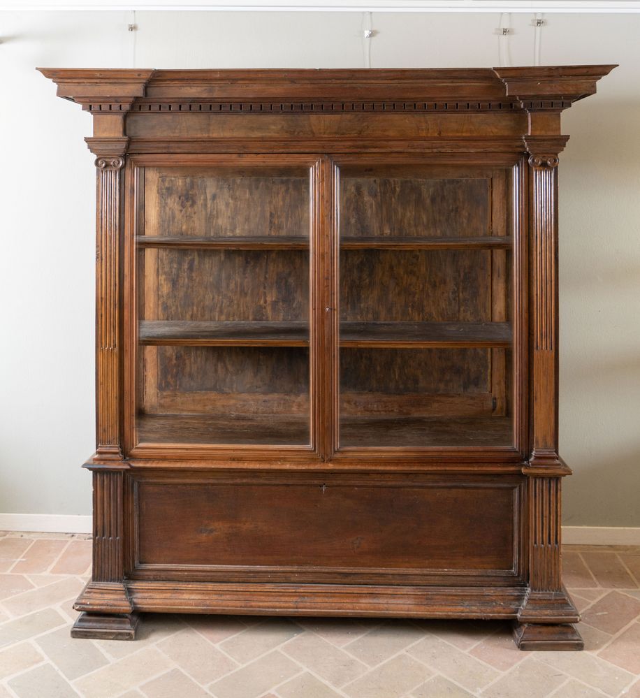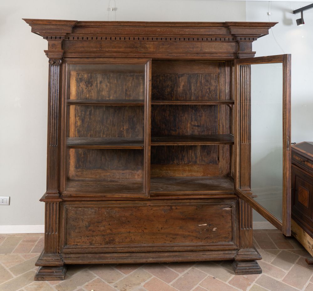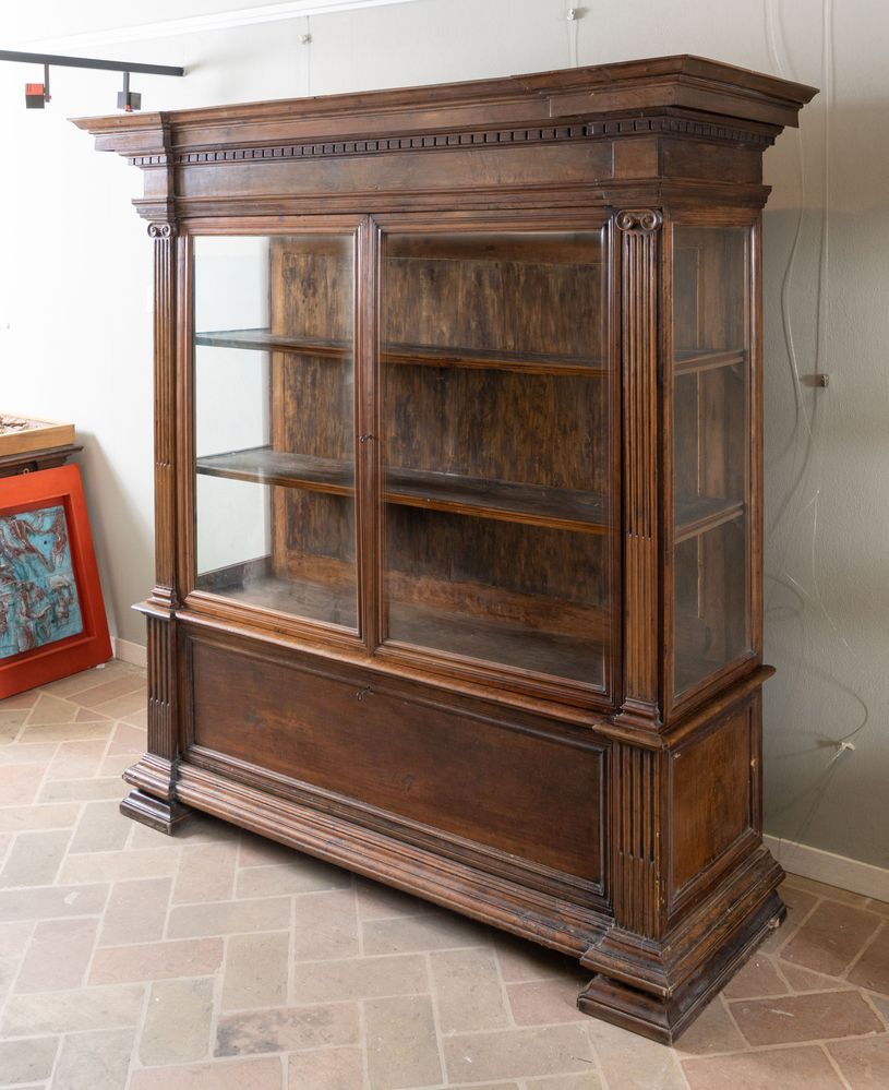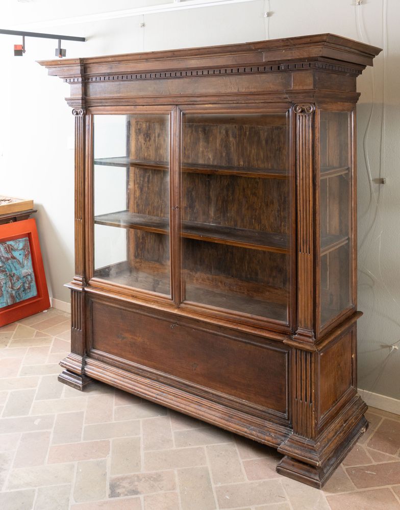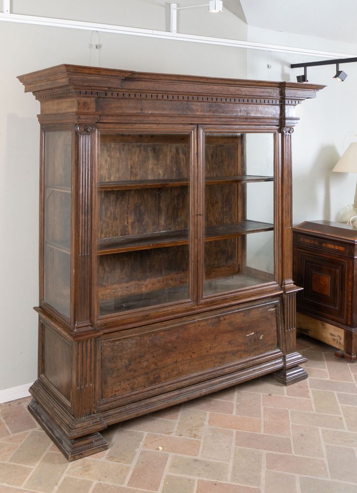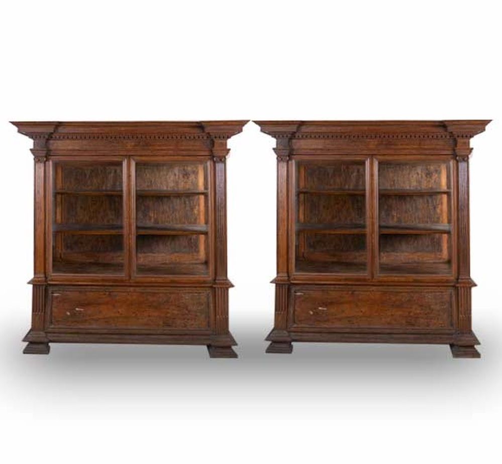 Coppia di vetrine in massello di noce. Inizi del XX secolo. Realizzate utilizzando materiale antico: riassemblaggio di parti del XVI e XVII secolo. I vetri sono soffiati a mano della fine del XIX secolo. Cm 187,5x184,5x64.