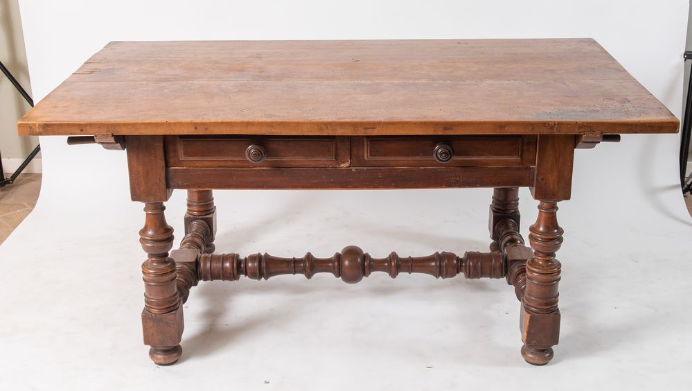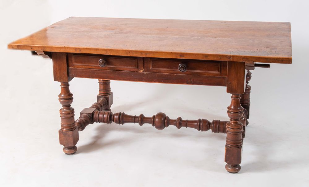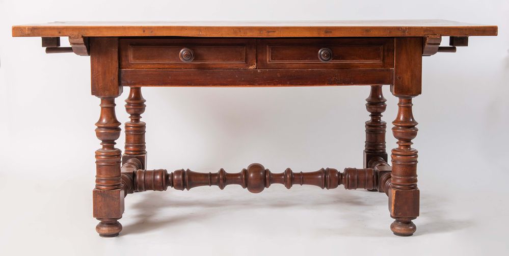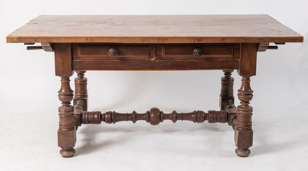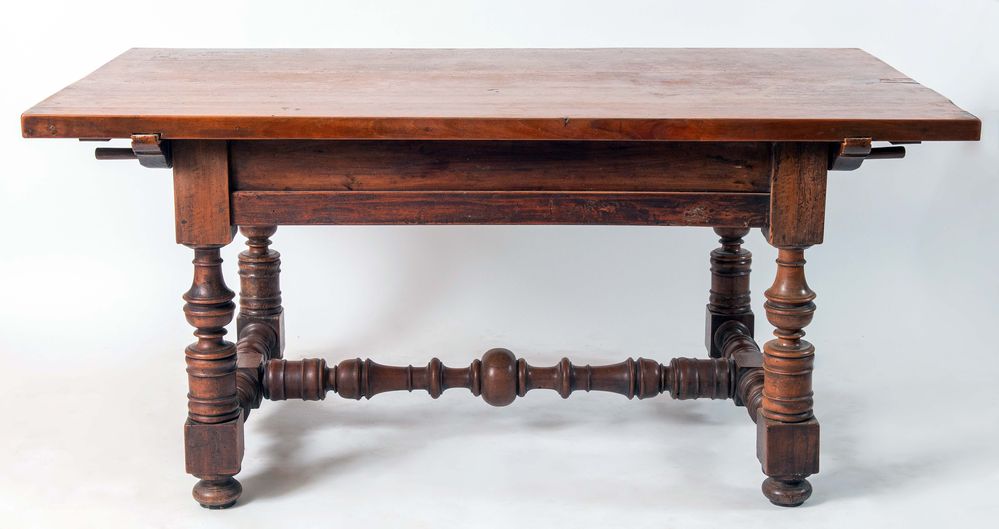 Tavolo a rocchetto in massello di noce. XVIII secolo. Cm 79,3x172,2x103. (rimaneggiature)