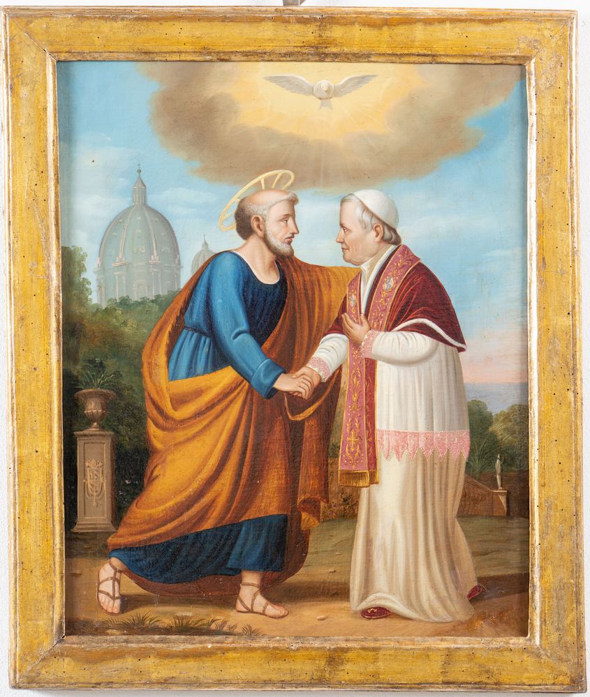 Lot 136 | Maestro del XIX secolo. "Incontro tra San Pietro e Pio IX". Olio su tela. Cm...
