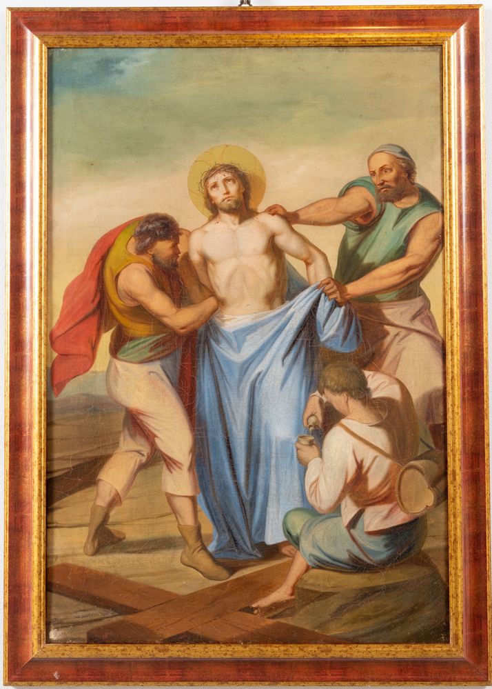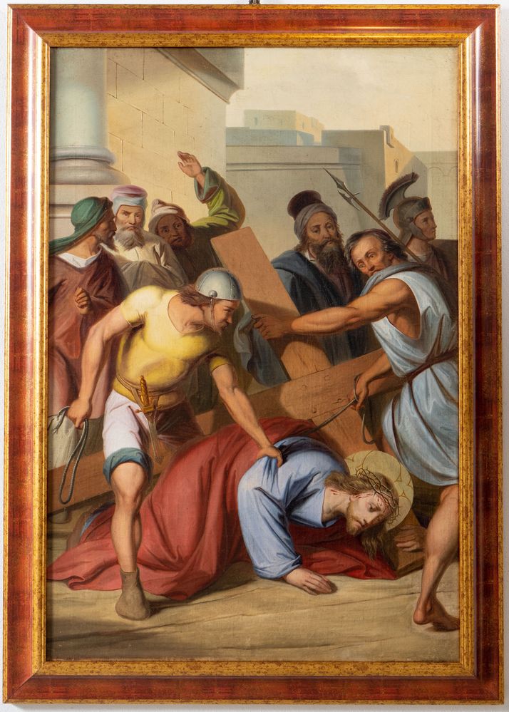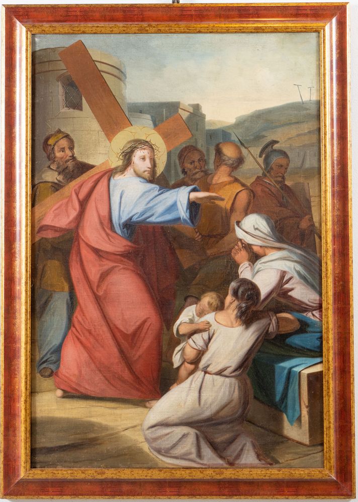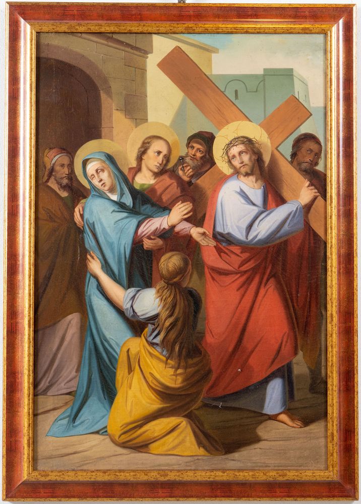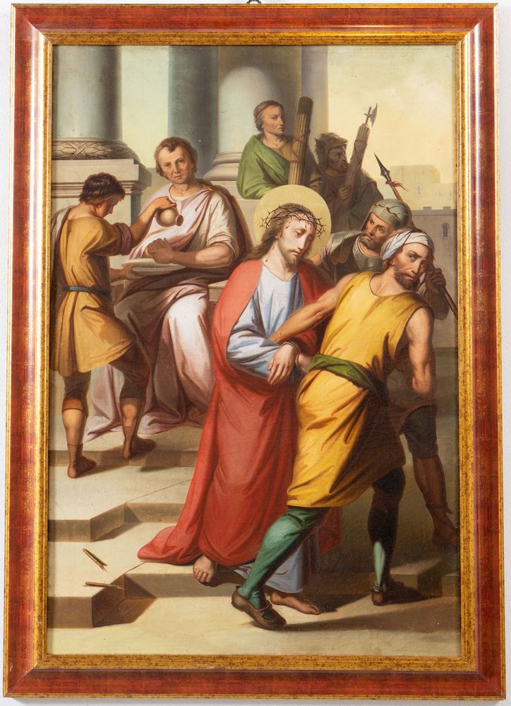 Maestro del XIX secolo. "Via Crucis". Lotto composto da quattordici oli su tela. Cm 97x65.