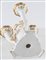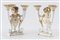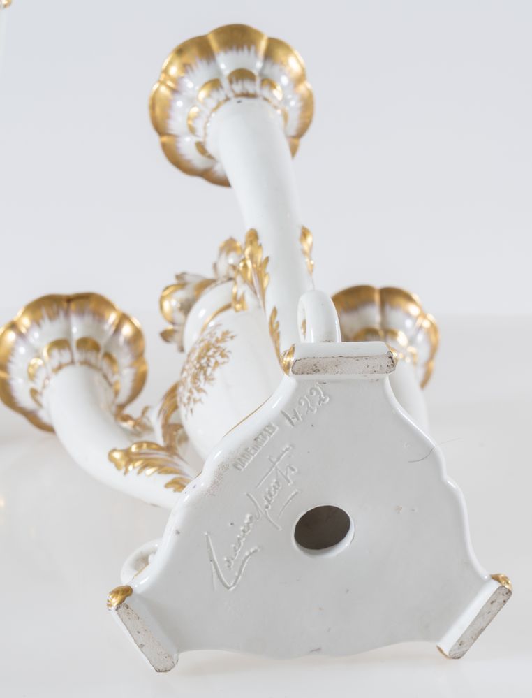 CACCIAPUOTI Coppia di candelabri in maiolica bianca con rifiniture in oro....