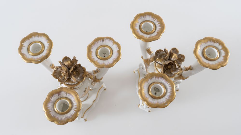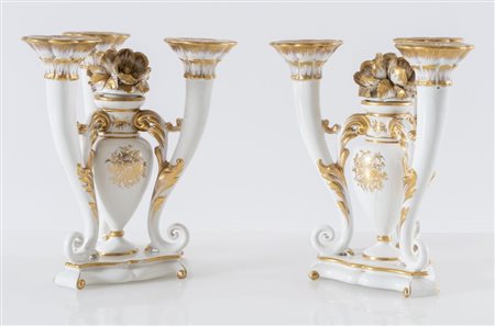 CACCIAPUOTI Coppia di candelabri in maiolica bianca con rifiniture in oro. Anni '30/'40 del XX secolo. Cadauno di cm 23x21x15.