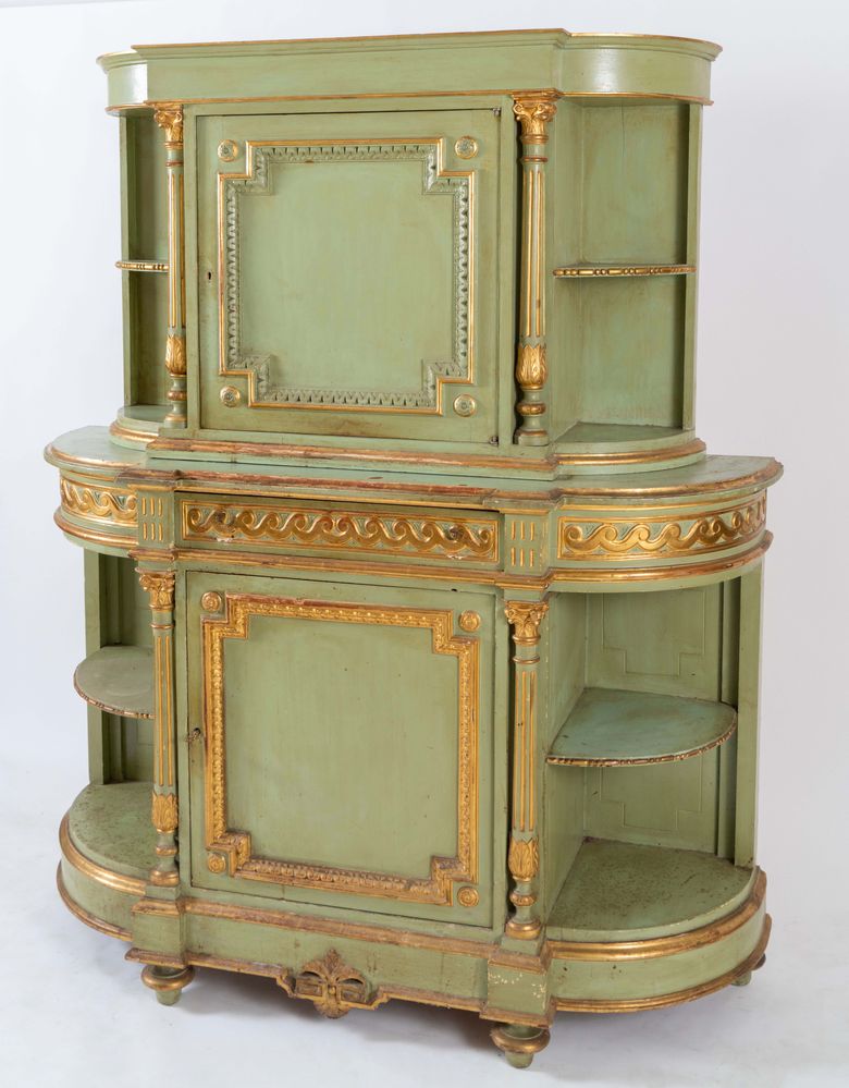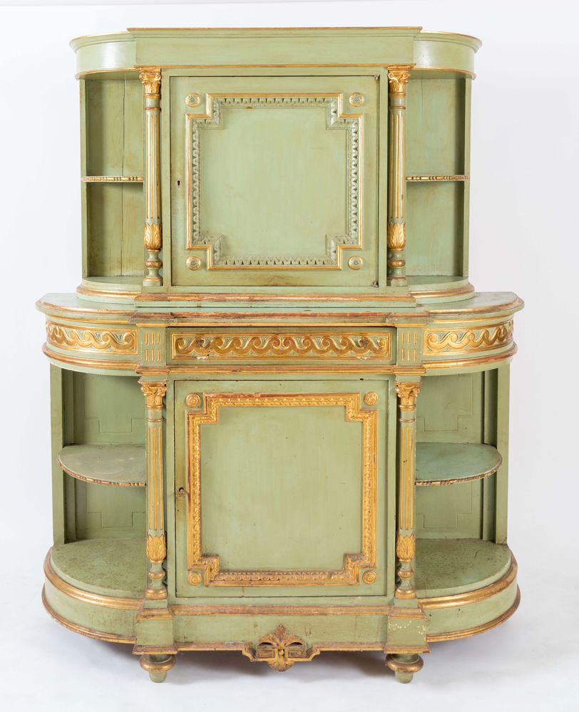 Piccola credenza con alzata in legno laccato sui toni del verde con finiture intagliate e dorate. Nord Italia, fine del XIX e inizio del XX secolo. Reca sportelli e cassetto nella parte centrale e vani a giorno nelle parti laterali bombate. Discreto stato di conservazione: all'interno reca vano con specchio aggiunti in un secondo momento. Cm 169x142,5x48.