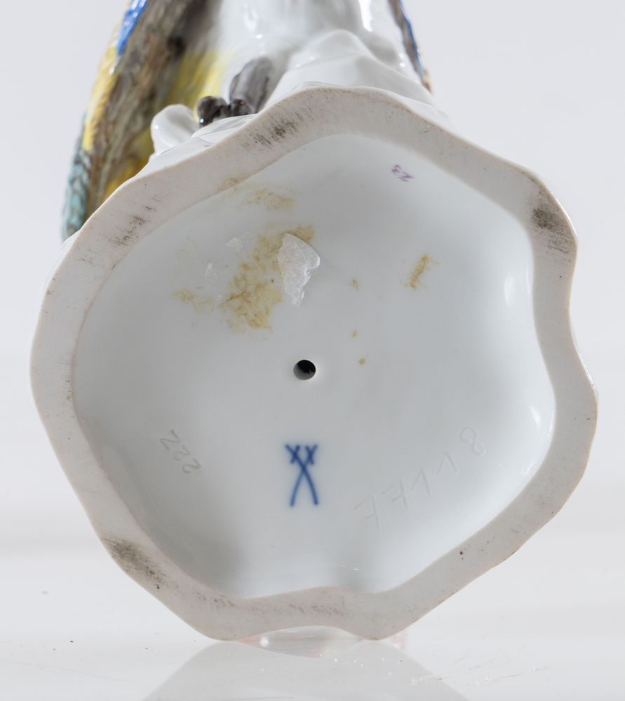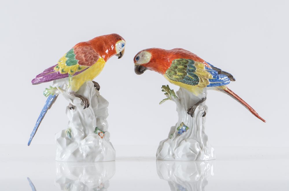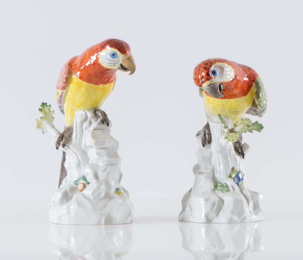 Lot 175 | Coppia di pappagalli in porcellana policroma. Meissen, XX secolo. Cm 21x9,5x15