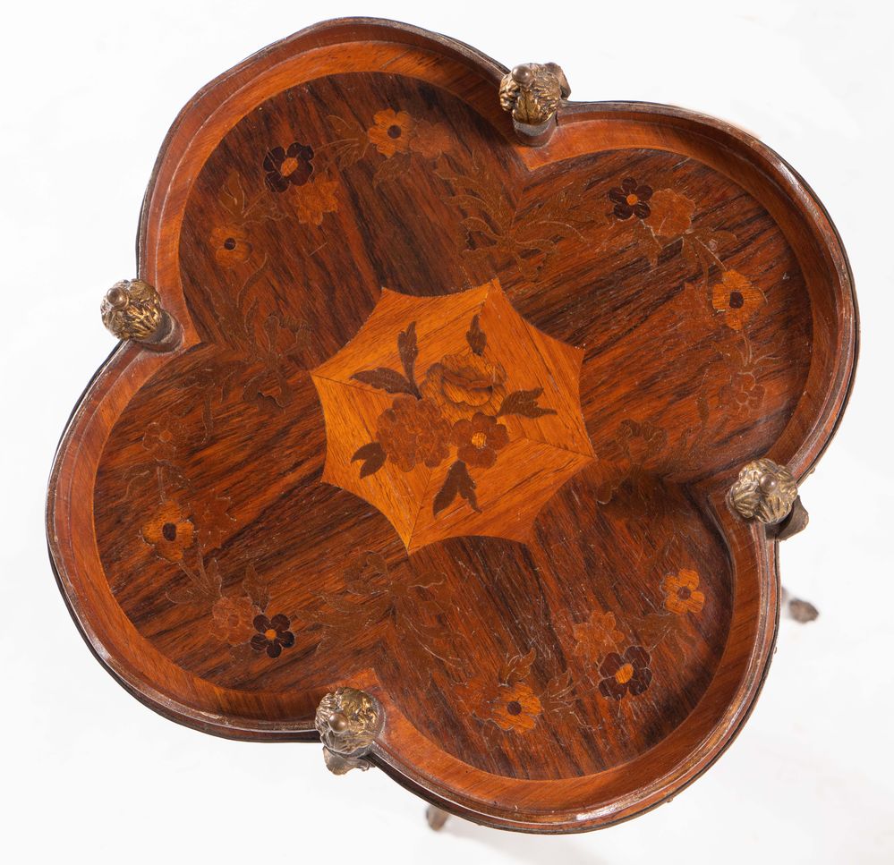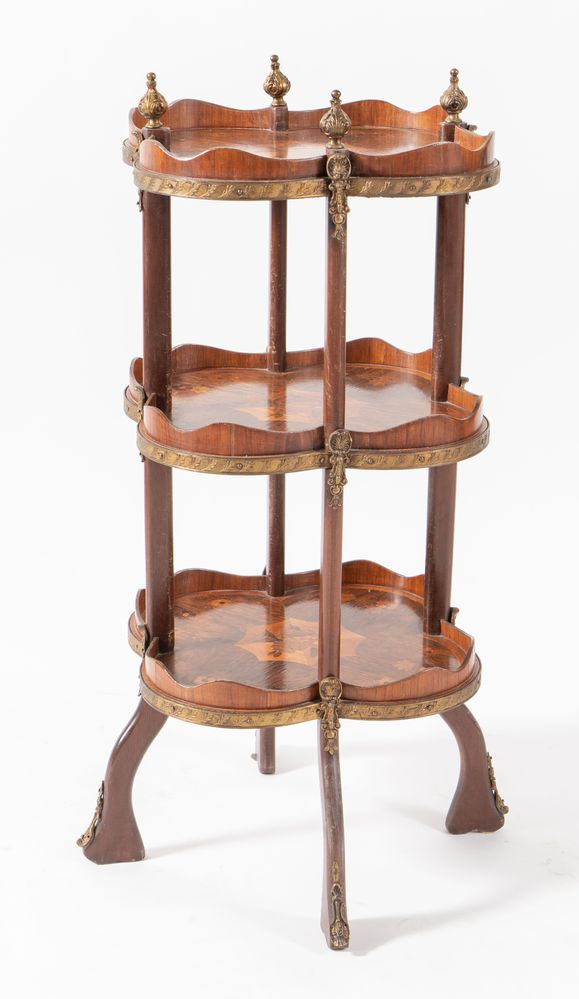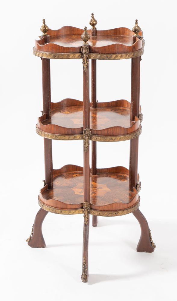 Piccolo etegeres da centro interamente lastronato in palissandro, bois de rose ed essenze esotiche. Francia, fine del XIX - inizi del XX secolo. Reca tre piani a quadrifoglio polilobati raccordati da sostegni mossi alla base e impreziositi da applicazioni in bronzo dorato. Cm 82x40x40.